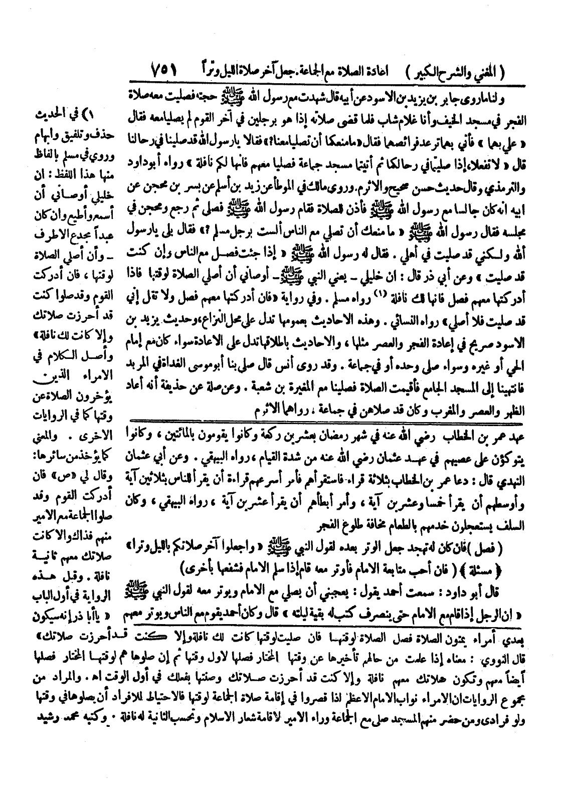 وعن أبي عثمان النهدي قال: دعا عمر بن الخطاب بثلاثة قراء فاستقرأهم فأمر أسرعهم قراءة أن يقرأ للناس بثلاثين آية وأوسطهم أن يقرأ خمسا وعشرين آية، وأمر أبطأهم أن يقرأ عشرين آية، رواه البيهقي، وكان السلف يستعجلون خدمهم بالطعام مخافة طلوع الفجر (فصل) فإن كان له تهجد جعل الوتر بعده لقول النبي صلى الله عليه وسلم " واجعلوا آخر صلاتكم بالليل وترا " (مسألة) (فإن أحب متابعة الإمام فأوتر معه قام إذا سلم الامام فشفعها بأخرى) قال أبو داود: سمعت أحمد يقول: يعجبني أن يصلي مع الإمام ويوتر معه لقول النبي صلى الله عليه وسلم " ان الرجل اذا قام مع الإمام حتى ينصرف كتب له بقية ليلته " قال وكان أحمد يقوم مع الناس ويوتر معهم