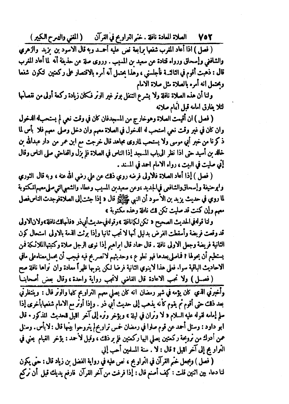 وسئل عمن أدرك من ترويحة ركعتين يصلي إليها ركعتين فلم ير ذلك، وقيل لاحمد: يؤخر القيام يعني في التراويح إلى آخر الليل؟ لا سنة المسلمين أحب إلي (فصل) ويجعل ختم القرآن في التراويح، نص عليه في رواية الفضل بن زياد قال: حتى يكون لنا دعاء بين اثنين قلت: كيف أصنع قال: إذا فرغت من آخر القرآن فارفع يديك قبل أن تركع