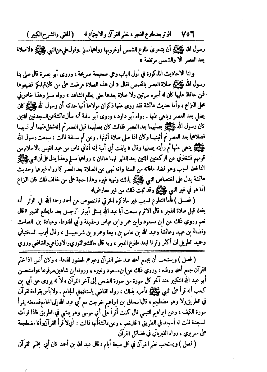 (فصل) ويستحب أن يجمع أهله عند ختم القرآن وغيرهم لحضور الدعاء، وكان أنس إذا ختم القرآن جمع أهله وولده، وروي ذلك عن ابن مسعود وغيره، ورواه ابن شاهين مرفوعا، واستحسن أبو عبد الله التكبير عند آخر كل سورة من سورة الضحى إلى آخر القرآن، لأنه يروي عن أبي بن كعب أنه قرأ على النبي صلى الله عليه وسلم فأمره بذلك، رواه القاضي باسناده في الجامع.