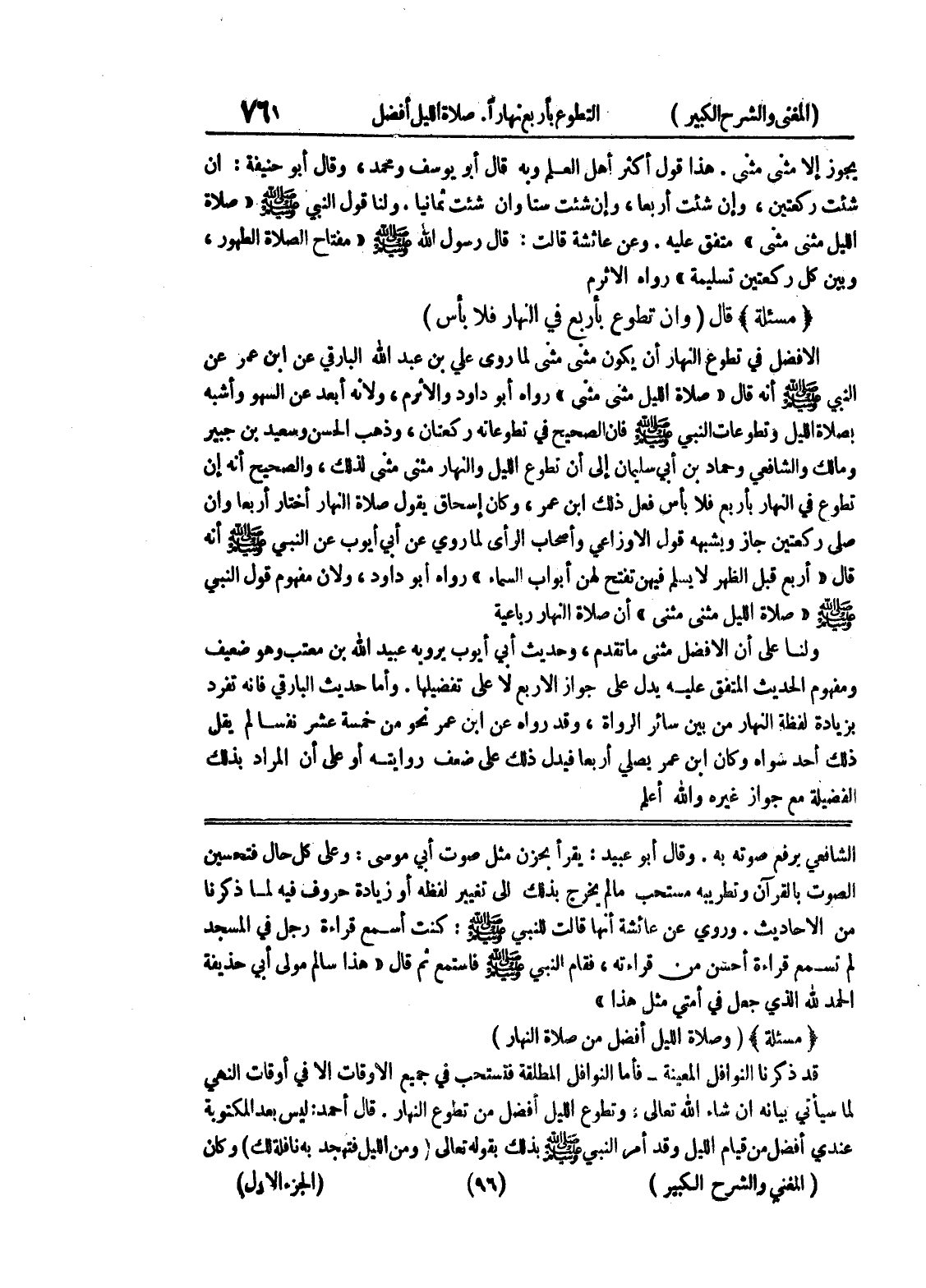 وروي عن عائشة أنها قالت للنبي صلى الله عليه وسلم: كنت أسمع قراءة رجل في المسجد لم نسمع قراءة أحسن من قراءته، فقام النبي صلى الله عليه وسلم فاستمع ثم قال " هذا سالم مولى أبي حذيفة الحمد لله الذي جعل في أمتي مثل هذا " (مسألة) (وصلاة الليل أفضل من صلاة النهار) قد ذكرنا النوافل المعينة - فأما النوافل المطلقة فتستحب في جميع الأوقات إلا في أوقات النهي لما سيأتي بيانه إن شاء الله تعالى: وتطوع الليل أفضل من تطوع النهار.