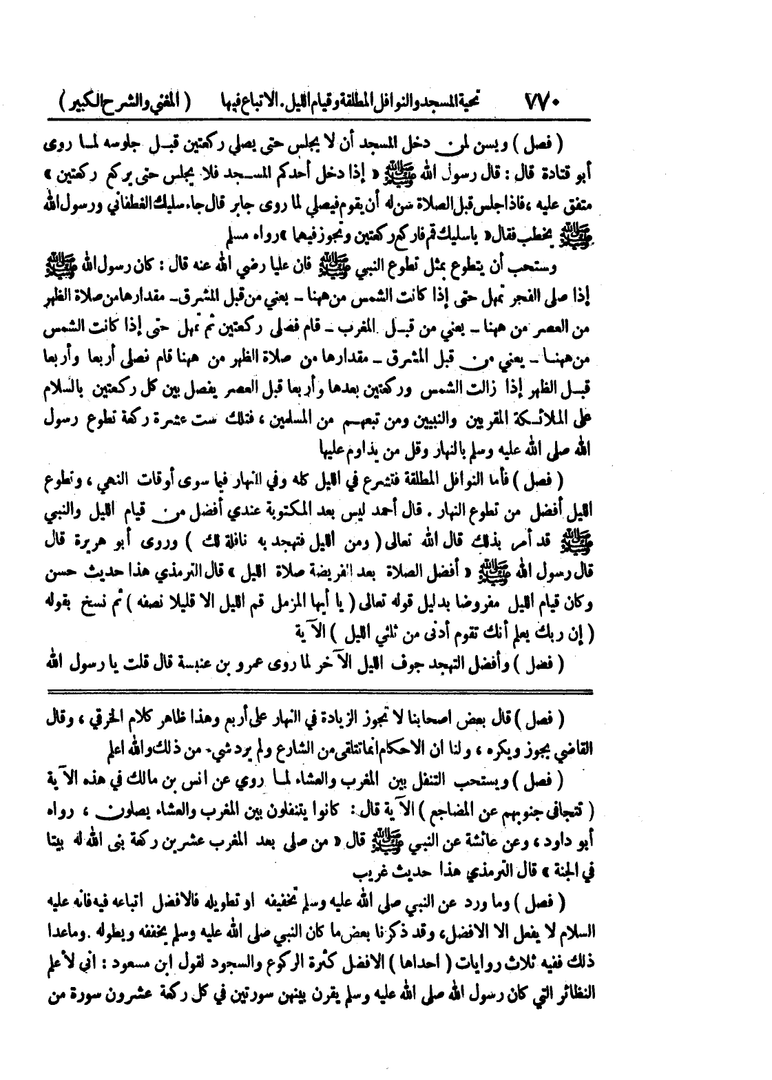 (فصل) قال بعض أصحابنا لا تجوز الزيادة في النهار على أربع وهذا ظاهر كلام الخرقي، وقال القاضي يجوز ويكره، ولنا أن الأحكام إنما تتلقى من الشارع ولم يرد شئ من ذلك والله أعلم (فصل) ويستحب التنفل بين المغرب والعشاء لما روي عن أنس بن مالك في هذه الآية (تتجافى جنوبهم عن المضاجع) الآية قال: كانوا يتنفلون بين المغرب والعشاء يصلون، رواه أبو داود، وعن عائشة عن النبي صلى الله عليه وسلم قال " من صلى بعد المغرب عشرين ركعة بنى الله له بيتا في الجنة " قال الترمذي هذا حديث غريب (فصل) وما ورد عن النبي صلى الله عليه وسلم تخفيفه أو تطويله فالأفضل اتباعه فيه فإنه عليه
