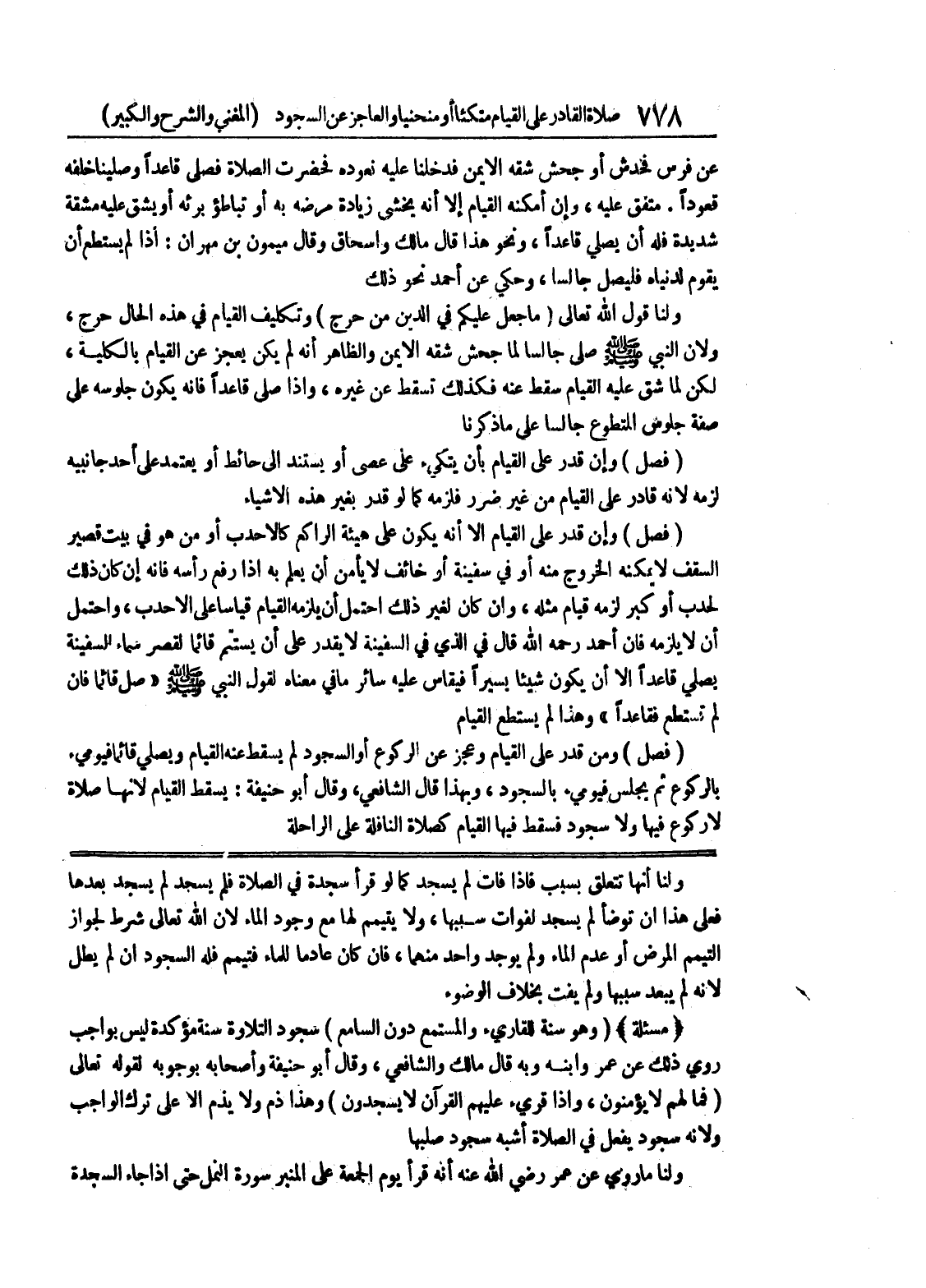 ولنا أنها تتعلق بسبب فإذا فات لم يسجد كما لو قرأ سجدة في الصلاة فلم يسجد لم يسجد بعدها فعلى هذا إن توضأ لم يسجد لفوات سببها، ولا يتيمم لها مع وجود الماء لأن الله تعالى شرط لجواز التيمم المرض أو عدم الماء ولم يوجد واحد منهما، فإن كان عادما للماء فتيمم فله السجود إن لم يطل لأنه لم يبعد سببها ولم يفت بخلاف الوضوء (مسألة) (وهو سنة للقارئ والمستمع دون السامع) سجود التلاوة سنة مؤكدة ليس بواجب روى ذلك عن عمر وابنه وبه قال مالك والشافعي، وقال أبو حنيفة وأصحابه بوجوبه لقوله تعالى