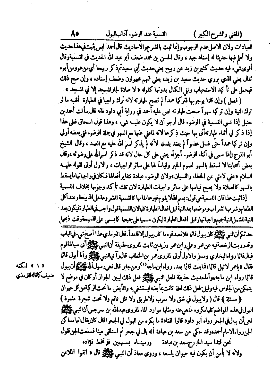 رواه ابن ماجه (1) وعن جابر قال نهى رسول الله صلى الله عليه وسلم أن يبول قائما رواه ابن ماجه، وأما حديث حذيفة فلعل النبي صلى الله عليه وسلم فعل ذلك ليبين الجواز أو كان في موضع لا يتمكن من الجلوس فيه وقيل فعل ذلك لعلة كانت بمأبضه ليستشفي به والمأبض ما تحت الركبة من كل حيوان (مسألة) قال (ولا يبول في شق ولا سرب ولا طريق ولاظل نافع ولا تحت شجرة مثمرة) البول في هذه المواضع كلها مكروه منهي عنه ومثلها موارد الماء لما روى عبد الله بن سرجس أن النبي صلى الله عليه وسلم نهى أن يبال في الجحر رواه أبو داود قالوا لقتادة ما يكره من البول في الجحر؟ قال كان يقال أنها مساكن الجن رواه الإمام أحمد، وقد حكي عن سعد بن عبادة أنه بال في جحر ثم استلقى ميتا فسمعت الجن تقول نحن قتلنا سيد الخزرج سعد بن عبادة * ورميناه بسهمين فلم نخط فؤاده ولأنه لا يأمن أن يكون فيه حيوان يلسعه، وروى معاذ أن النبي صلى الله عليه وسلم قال " اتقوا الملاعن