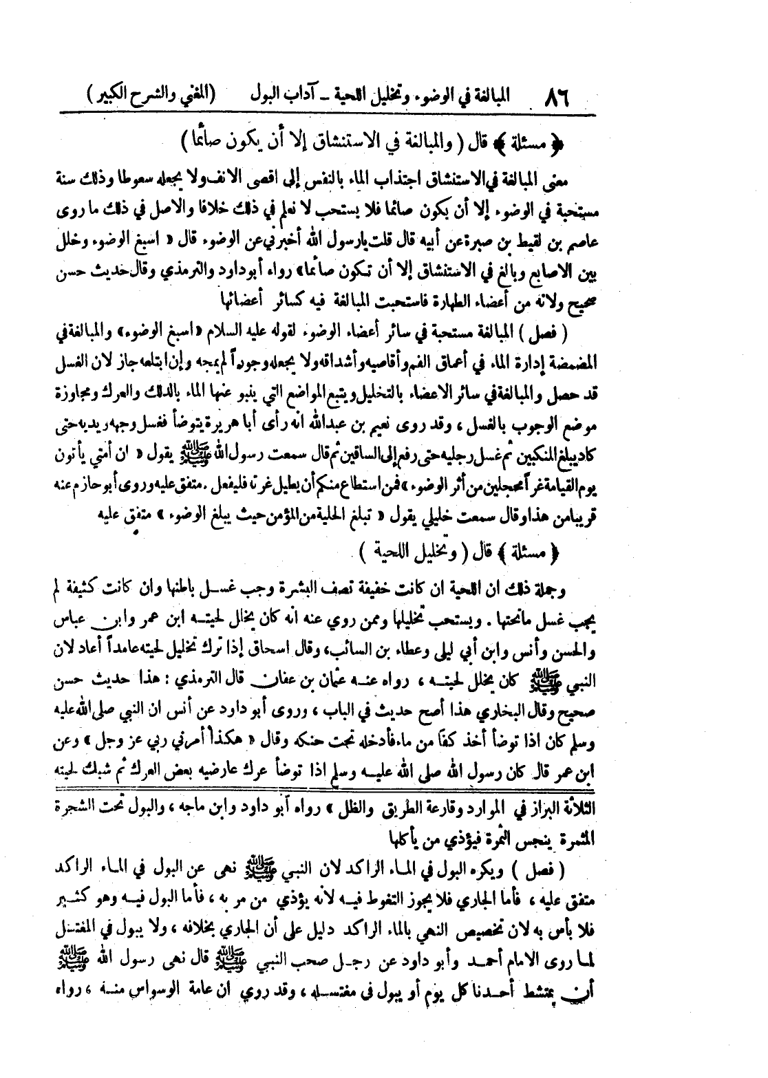الثلاثة البراز في الموارد وقارعة الطريق والظل " رواه أبو داود وابن ماجة، والبول تحت الشجرة المثمرة ينجس الثمرة فيؤذي من يأكلها (فصل) ويكره البول في الماء الراكد لأن النبي صلى الله عليه وسلم نهى عن البول في الماء الراكد متفق عليه، فأما الجاري فلا يجوز التغوط فيه لأنه يؤذي من مر به، فأما البول فيه وهو كثير فلا بأس به لأن تخصيص النهي بالماء الراكد دليل على أن الجاري بخلافه، ولا يبول في المغتسل