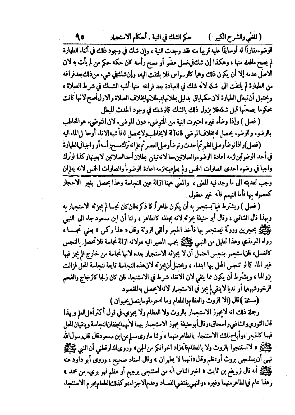 وجب تعديته إلى ما وجد فيه المعنى، والمعنى ههنا إزالة عين النجاسة وهذا يحصل بغير الأحجار كحصوله بها فأما التيمم فإنه غير معقول (فصل) ويشترط فيما يستجمر به أن يكون طاهرا كما ذكر، فإن كان نجسا لم يجزئه الاستجمار به وبهذا قال الشافعي، وقال أبو حنيفة يجزئه لأنه يجففه كالطاهر، ولنا أن ابن مسعود جاء إلى النبي صلى الله عليه وسلم بحجرين وروثة ليستجمر بها فأخذ الحجر وألقى الروثة وقال " هذا ركس " يعني نجسا، رواه الترمذي وهذا تعليل من النبي صلى الله عليه وسلم يجب المصير إليه، ولأنه إزالة نجاسة فلا تحصل بالنجس كالغسل، فإن استجمر بنجس احتمل أن لا يجزئه الاستجمار بعده لأنها نجاسة من خارج فلم يجز فيها غير الماء كما لو تنجس المحل بها ابتداء، ويحتمل أن يجزئه لأن هذه النجاسة تابعة لنجاسة المحل فزالت بزوالها، ويشترط أن يكون مما ينقي لأن الإنقاء شرط في الاستنجاء فإن كان زلجا كالزجاج والفحم الرخو وشبههما أو نديا لا ينقي لم يجز في الاستجمار لأنه لا يحصل به المقصود (مسألة) قال (إلا الروث والعظام والطعام وما له حرمة وما يتصل بحيوان) وجملة ذلك أنه لا يجوز الاستجمار بالروث ولا العظام ولا يجزئ في قول أكثر أهل العلم وبهذا قال الثوري والشافعي واسحاق، وقال أبو حنيفة يجوز الاستجمار بهما لأنهما يجففان النجاسة وينقيان المحل فهما كالحجر، وأباح مالك الاستنجاء بالطاهر منهما، ولنا ما روى مسلم عن ابن مسعود قال قال رسول الله صلى الله عليه وسلم " لا تستنجوا بالروث ولا بالعظام فإنه زاد إخوانكم من الجن " وروى الدارقطني أن النبي صلى الله عليه وسلم نهى أن يستنجى بروث أو عظم وقال " إنهما لا يطهران " وقال إسناد صحيح، وروى أبو داود عنه صلى الله عليه وسلم أنه قال لرويفع بن ثابت " أخبر الناس أنه من استنجى برجيع أو عظم فهو برئ من محمد " وهذا عام في الطاهر منهما وغيره، والنهي يقتضي الفساد وعدم الإجزاء، وكذلك الطعام يحرم الاستنجاء