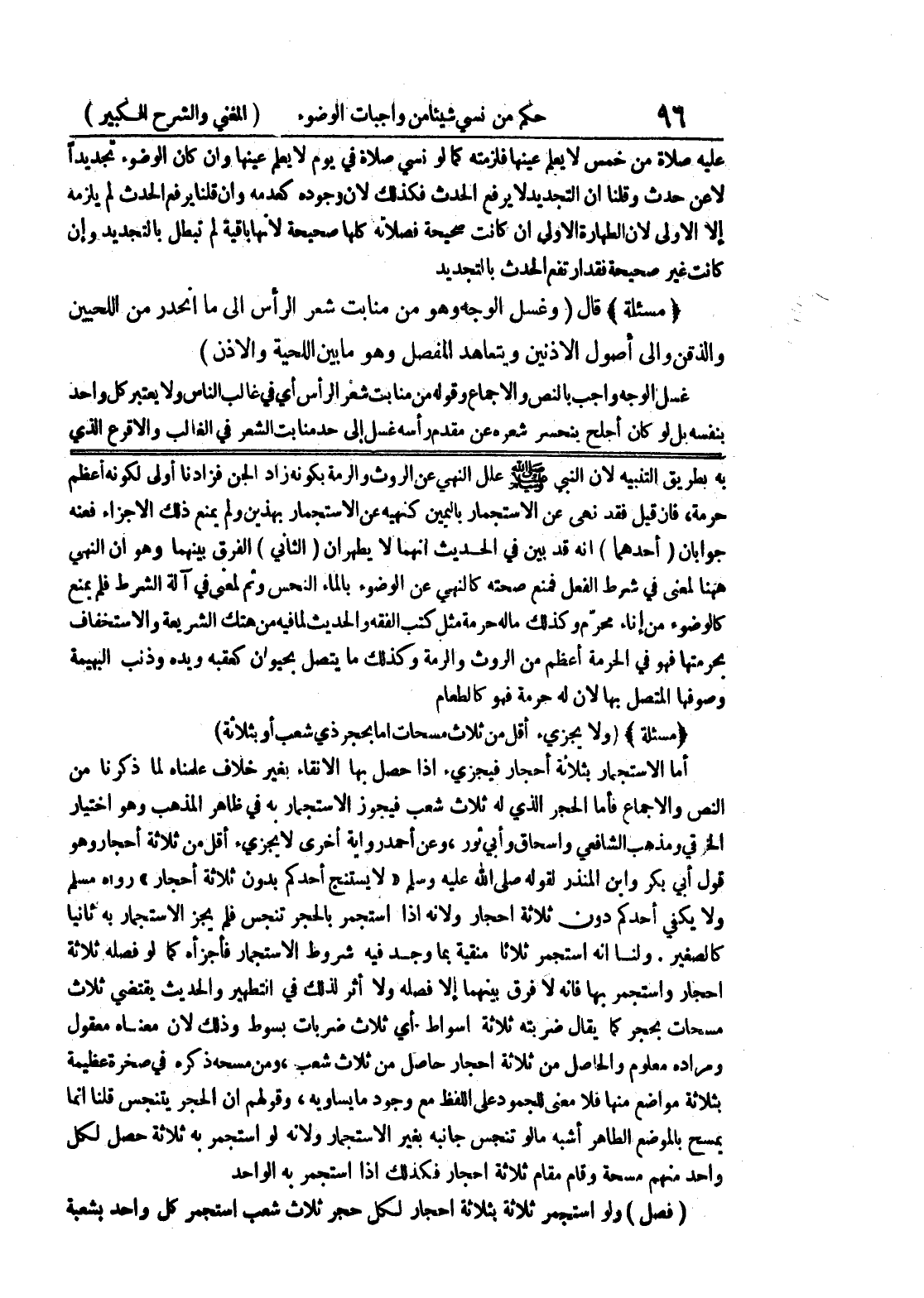 حرمة، فإن قيل فقد نهى عن الاستجمار باليمين كنهيه عن الاستجمار بهذين ولم يمنع ذلك الإجزاء فعنه جوابان (أحدهما) أنه قد بين في الحديث أنهما لا يطهران (الثاني) الفرق بينهما وهو أن النهي ههنا لمعنى في شرط الفعل فمنع صحته كالنهي عن الوضوء بالماء النجس وثم لمعنى في آلة الشرط فلم يمنع كالوضوء من إناء محرم وكذلك ماله حرمة مثل كتب الفقه والحديث لما فيه من هتك الشريعة والاستخفاف بحرمتها فهو في الحرمة أعظم من الروث والرمة وكذلك ما يتصل بحيوان كعقبه ويده وذنب البهيمة وصوفها المتصل بها لأن له حرمة فهو كالطعام (مسألة) (ولا يجزئ أقل من ثلاث مسحات إما بحجر ذي شعب أو بثلاثة) أما الاستجمار بثلاثة أحجار فيجزئ إذا حصل بها الإنقاء بغير خلاف علمناه لما ذكرناه من النص والإجماع فأما الحجر الذي له ثلاث شعب فيجوز الاستجمار به في ظاهر المذهب وهو اختيار الخرقي ومذهب الشافعي واسحاق وأبي ثور، وعن أحمد رواية أخرى لا يجزئ أقل من ثلاثة أحجار وهو قول أبي بكر وابن المنذر لقوله صلى الله عليه وسلم " لا يستنج أحدكم بدون ثلاثة أحجار " رواه مسلم ولا يكفي أحدكم دون ثلاثة أحجار ولأنه إذا استجمر بالحجر تنجس فلم يجز الاستجمار به ثانيا كالصغير.