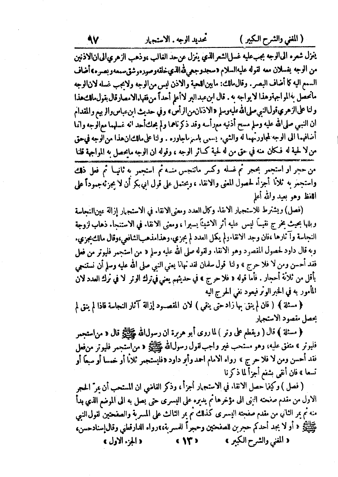 فأما قوله " فلا حرج " في حديثهم يعني في ترك الوتر لا في ترك العدد لأن المأمور به في الخبر الوتر فيعود نفي الحرج اليه (مسألة) (فإن لم ينق بها زاد حتى ينقي) لان المقصود إزالة آثار النجاسة فإذا لم ينق لم يحصل مقصود الاستجمار (مسألة) قال (ويقطع على وتر) لما روى أبو هريرة أن رسول الله صلى الله عليه وسلم قال " من استجمر فليوتر " متفق عليه، وهو مستحب غير واجب لقول رسول الله صلى الله عليه وسلم " من استجمر فليوتر من فعل فقد أحسن ومن لا فلا حرج " رواه الإمام أحمد وأبو داود " فليستجمر ثلاثا أو خمسا أو سبعاً أو تسعا " فإن أنقى بشفع أجزأ لما ذكرنا (فصل) وكيفما حصل الإنقاء في الاستجمار أجزأ، وذكر القاضي أن المستحب أن يمر الحجر الأول من مقدم صفحته اليمنى إلى مؤخرها ثم يديره على اليسرى حتى يصل به إلى الموضع الذي بدأ منه ثم يمر الثاني من مقدم صفحته اليسرى كذلك ثم يمر الثالث على المسربة والصفحتين لقول النبي صلى الله عليه وسلم " أو لا يجد أحدكم حجرين للصفحتين وحجرا للمسربة، " رواه الدارقطني وقال إسناد حسن،