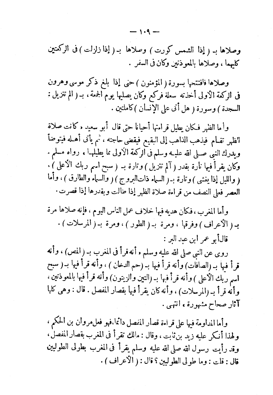 وأما المداومة فيها على قراءة قصار المفصل دائمًا، فهو فعل مروان بن الحكم، ولهذا أنكر عليه زيد بن ثابت، وقال: مالك تقرأ في المغرب بقصار المفصل، وقد رأيت رسول الله صلى الله عليه وسلم يقرأ في المغرب بطولي الطوليين قال: قلت: وما طولى الطوليين، قال: قلت: وما طولى الطوليين؟ قال: (الأعراف) .