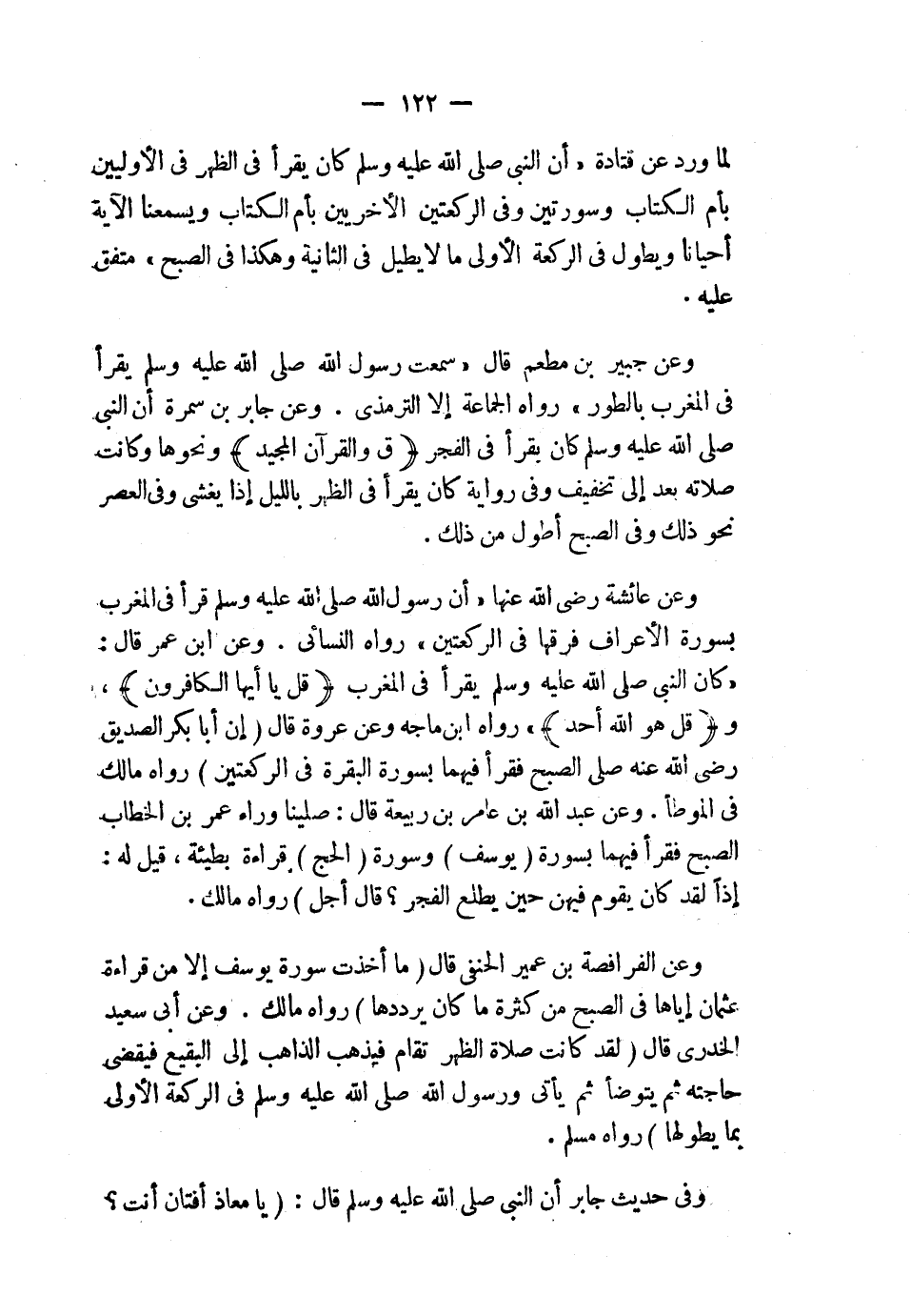 وعن الفرافصة بن عمير الحنفي قال: «ما أخذت سورة يوسف إلا من قراءة عثمان إياها في الصبح من كثرة ما كان يرددها» رواه مالك. وعن أبي سعيد الخدري قال: «لقد كانت صلاة الظهر تقام فيذهب الذاهب إلى البقيع فيقضي حاجته ثم يتوضأ ثم يأتي ورسول الله صلى الله عليه وسلم في الركعة الأولى بما يطولها» رواه مسلم.