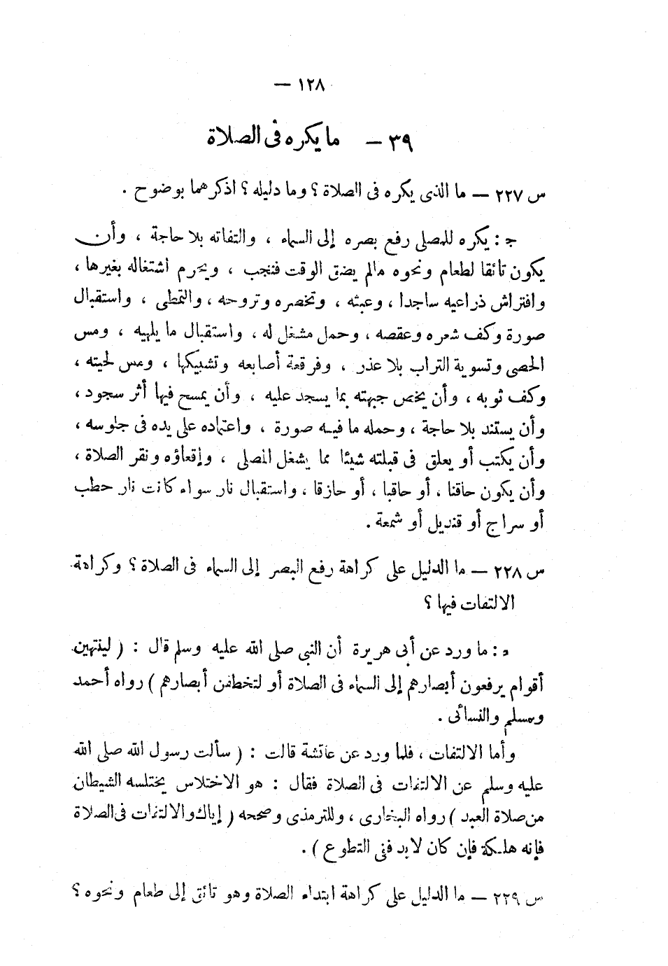 س228: ما الدليل على كراهة رفع البصر إلى السماء في الصلاة؟ وكراهة الالتفات فيها؟