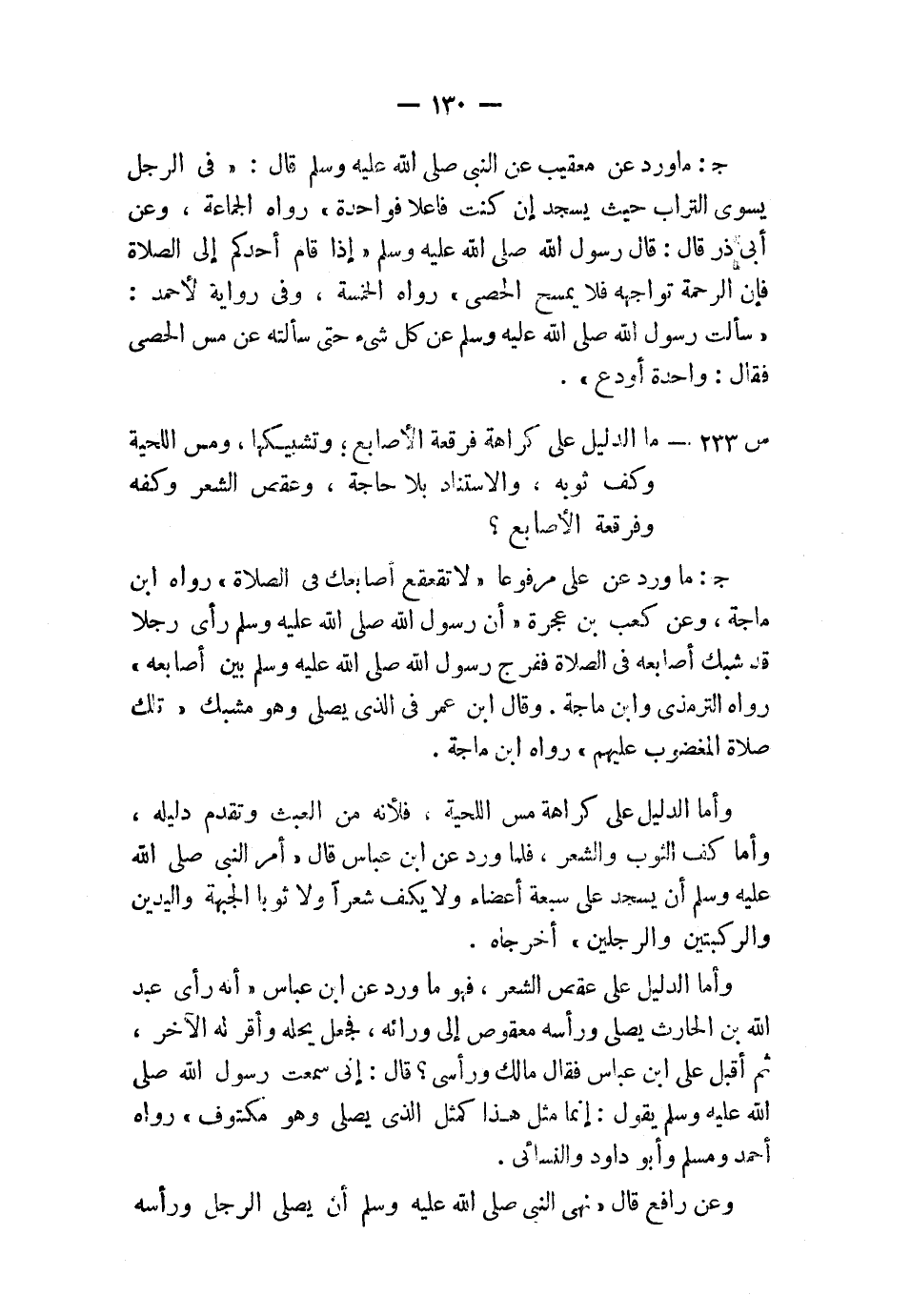 س233: ما الدليل على كراهة فرقعة الأصابع، وتشبيكها، ومس اللحية، وكف ثوبه، والاستناد بلا حاجة، وعقص الشعر وكفه وفرقعة الأصابع؟