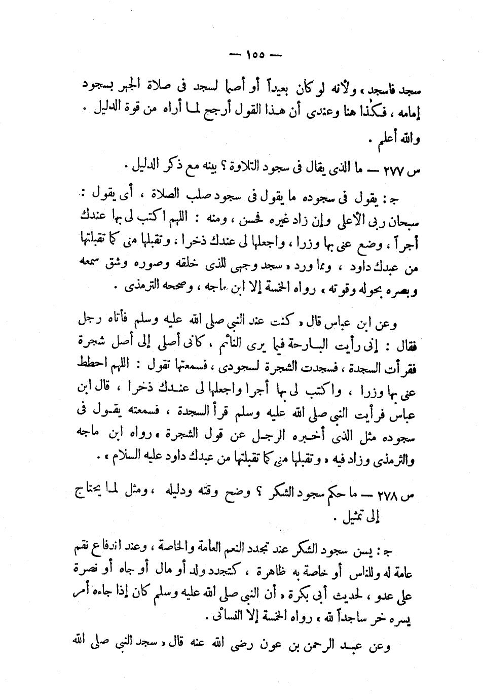 وعن ابن عباس قال: «كنت عند النبي صلى الله عليه وسلم فأتاه رجل، فقال: إني رأيت البارحة فيما يرى النائم، كأني أصلي إلى أصل شجرة فقرأت السجدة، فسجدت الشجرة لسجودي، فسمعتها تقول: اللهم احطط عني بها وزرًا، واكتب لي بها أجرًا، واجعلها لي عندك ذخرًا، قال ابن عباس: فرأيت النبي صلى الله عليه وسلم قرأ السجدة، فسمعته يقول في سجوده مثل الذي أخبره الرجل عن قول الشجرة» رواه ابن ماجه والترمذي، وزاد فيه: «وتقبلها مني كما تقبلتها من عبدك داود –عليه السلام-» .