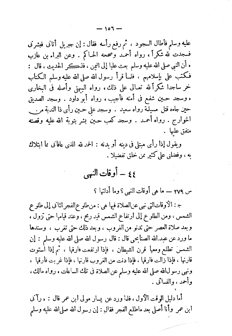 ج: الأوقات التي نهى عن الصلاة فيها، هي: من طلوع الفجر الثاني إلى طلوع الشمس، ومن الطلوع إلى ارتفاع الشمس قيد رمح، وعند قيامها حتى تزول، وبعد صلاة العصر حتى تدنو من الغروب، وبعد ذلك حتى تغرب، وسندها ما ورد عن عبد الله الصنابحي قال: قال رسول الله صلى الله عليه وسلم: «إن الشمس تطلع ومعها قرن الشيطان، فإذا ارتفعت فارقها، ثم إذا استوت قارنها، فإذا زالت فارقها، فإذا دنت من الغروب قارنها، فإذا غربت فارقها» ونهى رسول الله صلى الله عليه وسلم عن الصلاة في تلك الساعات، رواه مالك وأحمد والنسائي.