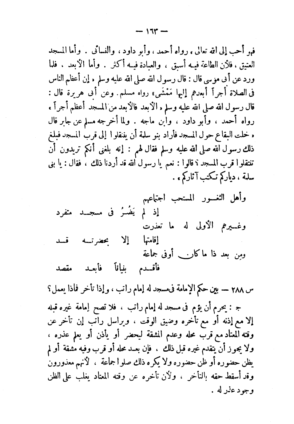 فهو أحب إلى الله تعالى» رواه أحمد، وأبو داود، والنسائي؛ وأما المسجد العتيق، فلأن الطاعة فيه أسبق، والعبادة فيه أكثر، وأما الأبعد، فلما ورد عن أبي موسى قال: قال موسى قال: قال رسول الله صلى الله عليه وسلم: «إن أعظم الناس في الصلاة أجرًا أبعدهم إليها مَمْشَى» رواه مسلم، وعن أبي هريرة قال: قال رسول الله صلى الله عليه وسلم: «الأبعد فالأبعد من المسجد أعظم أجرًا» رواه أحمد، وأبو داود، وابن ماجه.