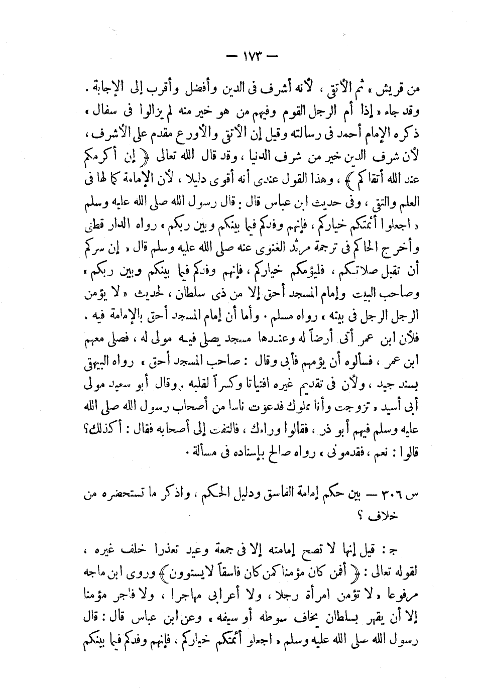 من قريش» ثم الأتقى؛ لأنه أشرف في الدين وأفضل وأقرب إلى الإجابة، وقد جاء: «إذا أمَّ الرجل القوم وفيهم من هو خير منه لم يزالوا في سفال» ذكره الإمام أحمد في «رسالته» ، وقيل: إن الأتقى والأورع مقدم على الأشرف؛ لأن شرف الدين خير من شرف الدنيا، وقد قال الله تعالى: {إِنَّ أَكْرَمَكُمْ عِندَ اللَّهِ أَتْقَاكُمْ} ، وهذا القول عندي أنه أقوى دليلاً؛ لأن الإمامة كما لها في العلم والتقى، وفي حديث ابن عباس قال: قال رسول الله صلى الله عليه وسلم: «اجعلوا أئمتكم خياركم، فإنهم وفدكم فيما بينكم وبين ربكم» رواه الدارقطني وأخرج الحاكم في ترجمة مرثد الغنوي عنه صلى الله عليه وسلم قال: «إن سركم أن تقبل صلاتكم، فليؤمكم خياركم، فإنهم وفدكم فيما بينكم وبين ربكم» وصاحب البيت وإمام المسجد أحق إلا من ذي سلطان، لحديث: «لا يؤمن الرجل الرجل في بيته» رواه مسلم؛ وأما أن إمام المسجد أحق بالإمامة فيه، فلأن ابن عمر أتى أرضًا له وعندها مسجد يصلي فيه مولى له، فصلى معهم ابن عمر، فسألوه أن يؤمهم فأبى وقال: «صاحب المسجد أحق» رواه البيهقي بسند جيد، ولأن في تقديم غيره افتياتًا وكسرًا لقلبه، وقال أبو سعيد مولى أبي أسيد: «تزوجت وأنا مملوك فدعوت ناسًا من أصحاب رسول الله صلى الله عليه وسلم فيهم أبو ذر، فقالوا: وراءك، فالتفت إلى أصحابه، فقال: أكذلك؟ قالوا: نعم، فقدموني» رواه صالح بإسناده في مسألة.