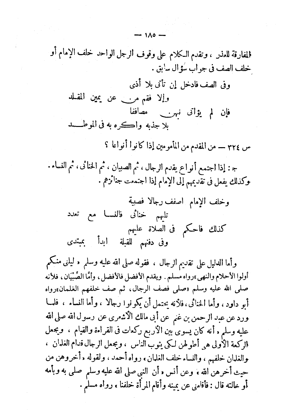وخلف الإمام اصفف رجالاً فصبية ... تليهم خناثى فالنسا مع تعدد