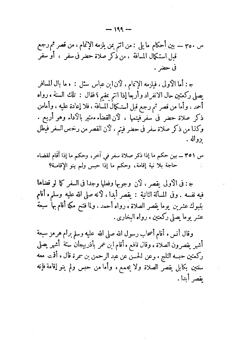ج: أما الأولى، فيلزمه الإتمام؛ لأن ابن عباس سُئل: «ما بال المسافر يصلي ركعتين حال الانفراد وأربعًا إذا ائتم بمقيم؟ فقال: تلك السُّنة» رواه أحمد؛ وأما من قصر ثم رجع قبل استكمال المسافة، فلا إعادة عليه؛ وأما من ذكر صلاة حضر في سفر فيتمها؛ لأن القضاء معتبر بالأداء وهو أربع، وكذا من ذكر صلاة سفر في حضر فيتم؛ لأن القصر من رخص السفر فبطل بزواله.