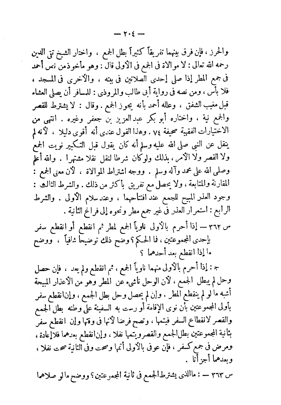 والحرز، فإن فرق بينهما تفريقًا كثيرًا بطل الجمع، واختار الشيخ تقي الدين –رحمه الله تعالى-: لا موالاة في الجمع في الأولى، قال: وهو مأخوذ من نص أحمد في جمع المطر إذا صلى إحدى الصلاتين في بيته، والأخرى في المسجد، فلا بأس، ومن نصه في رواية أبي طالب والمروذي: للمسافر أن يصلي العشاء قبل مغيب الشفق، وعلله أحمد بأنه يجوز الجمع، وقال: لا يشترط للقصر والجمع نية، واختاره أبو بكر عبد العزيز بن جعفر وغيره. انتهى من «الاختيارات الفقهية» (صحيفة 74) ، وهذا القول عندي أنه أقوى دليلاً؛ لأنه لم ينقل عن النبي صلى الله عليه وسلم أنه كان يقول قبل التكبير نويت الجمع ولا القصر ولا الأمر، بذلك ولو كان شرطًا لنقل نقلاً مشتهرًا. والله أعلم، وصلى الله على محمد وآله وسلم. ووجه اشتراط الموالاة؛ لأن معنى الجمع: المقارنة والمتابعة، ولا يحصل مع تفريق بأكثر من ذلك. والشرط الثالث: وجود العذر المبيح للجمع عند افتتاحهما، وعند سلام الأولى. والشرط الرابع: استمرار العذر في غير جمع مطر ونحوه إلى فراغ الثانية.