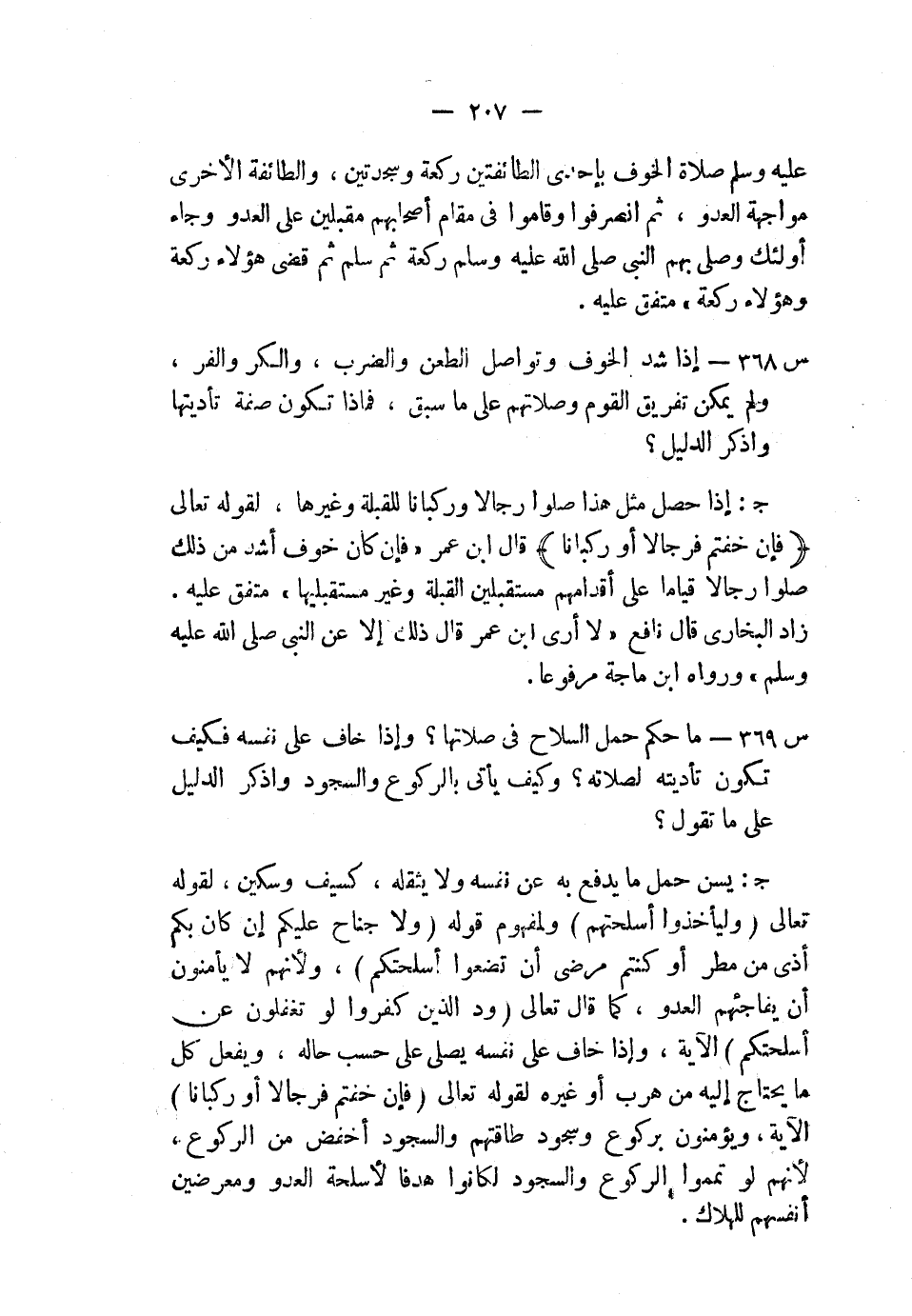 س368: إذا شد الخوف وتواصل الطعن والضرب، والكر والفر، ولم يمكن تفريق القوم وصلاتهم على ما سبق، فماذا تكون صفة تأديتها واذكر الدليل؟