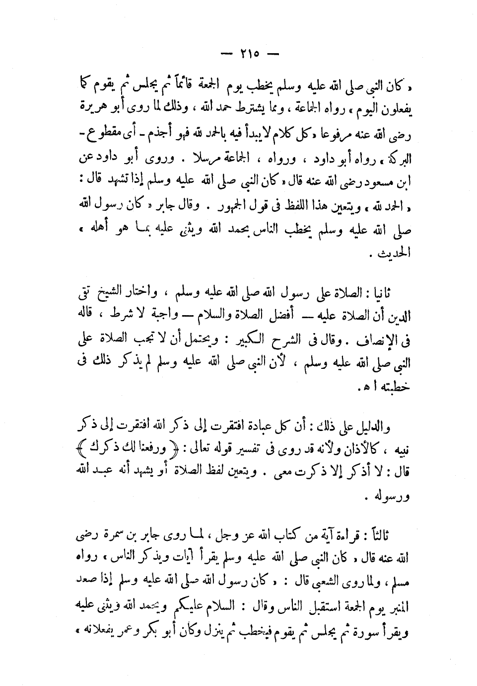 «كان النبي صلى الله عليه وسلم يخطب يوم الجمعة قائمًا ثم يجلس ثم يقوم كما يفعلون اليوم» رواه الجماعة، ومما يشترط حمد الله، وذلك لما روى أبو هريرة - رضي الله عنه - مرفوعًا: «كل كلام لا يبدأ فيه بالحمد لله فهو أجزم –أي مقطوع- البركة» رواه أبو داود، ورواه الجماعة مرسلاً.