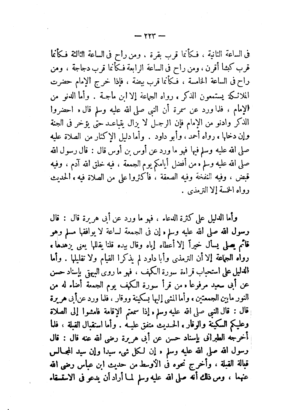 وأما الدليل على كثرة الدعاء، فهو ما ورد عن أبي هريرة قال: قال رسول الله صلى الله عليه وسلم: «إن في الجمعة لساعة لا يوافقها مسلم وهو قائم يصلي يسأل خيرًا إلا أعطاه إياه، وقال: بيده قلنا يقللها يعني يزدهدها» رواه الجماعة إلا أن الترمذي وأبا داود لم يذكر القيام ولا تقليلها؛ وأما الدليل على استحباب قراءة سورة الكهف، فهو ما روى البيهقي بإسناد حسن عن أبي سعيد مرفوعًا: «من قرأ سورة الكهف يوم الجمعة أضاء له من النور ما بين الجمعتين» ؛ وأما المشي إليها بسكينة ووقار، فلما ورد عن أبي هريرة قال: قال النبي صلى الله عليه وسلم: «إذا سمعتم الإقامة فامشوا إلى الصلاة وعليكم بالسكينة والوقار» الحديث متفق عليه؛ وأما استقبال القبلة، فلما أخرجه الطبراني بإسناد حسن عن أبي هريرة - رضي الله عنه - قال: قال رسول الله صلى الله عليه وسلم: «إن لكل شيء سيدًا وإن سيد المجالس قبالة القبلة» وأخرج نحوه في «الأوسط» من حديث ابن عباس ـ رضي الله عنهما ـ، ومن ذلك أنه صلى الله عليه وسلم لما أراد أن يدعو في الاستسقاء