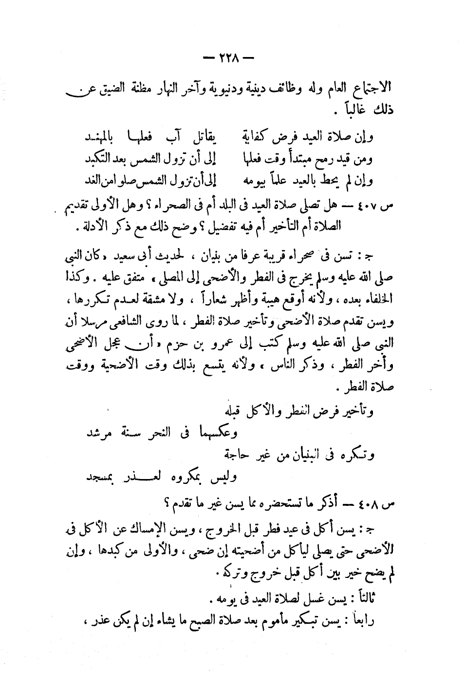 وإن صلاة العيد فرض كفاية ... يقاتل آب فعلها بالمهند