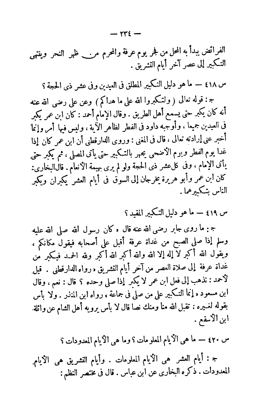 ج: ما روى جابر - رضي الله عنه - قال: «كان رسول الله صلى الله عليه وسلم إذا صلى الصبح من غداة عرفة أقبل على أصحابه، فيقول: «مكانكم» ، ويقول: «الله أكبر لا إله إلا الله والله أكبر الله أكبر ولله الحمد فيكبر» فيكبر من غداة عرفة إلى صلاة العصر من آخر أيام التشريق» رواه الدارقطني، قيل لأحمد: تذهب إلى فعل ابن عمر لا يكبر إذا صلى وحده؟ , قال: نعم، وقال ابن مسعود: «إنما التكبير على من صلى في جماعة» رواه ابن المنذر، ولا بأس بقوله لغيره: تقبل الله منا ومنك نصًا، قال: لا بأس يرويه أهل الشام عن واثلة ابن الأسقع.
