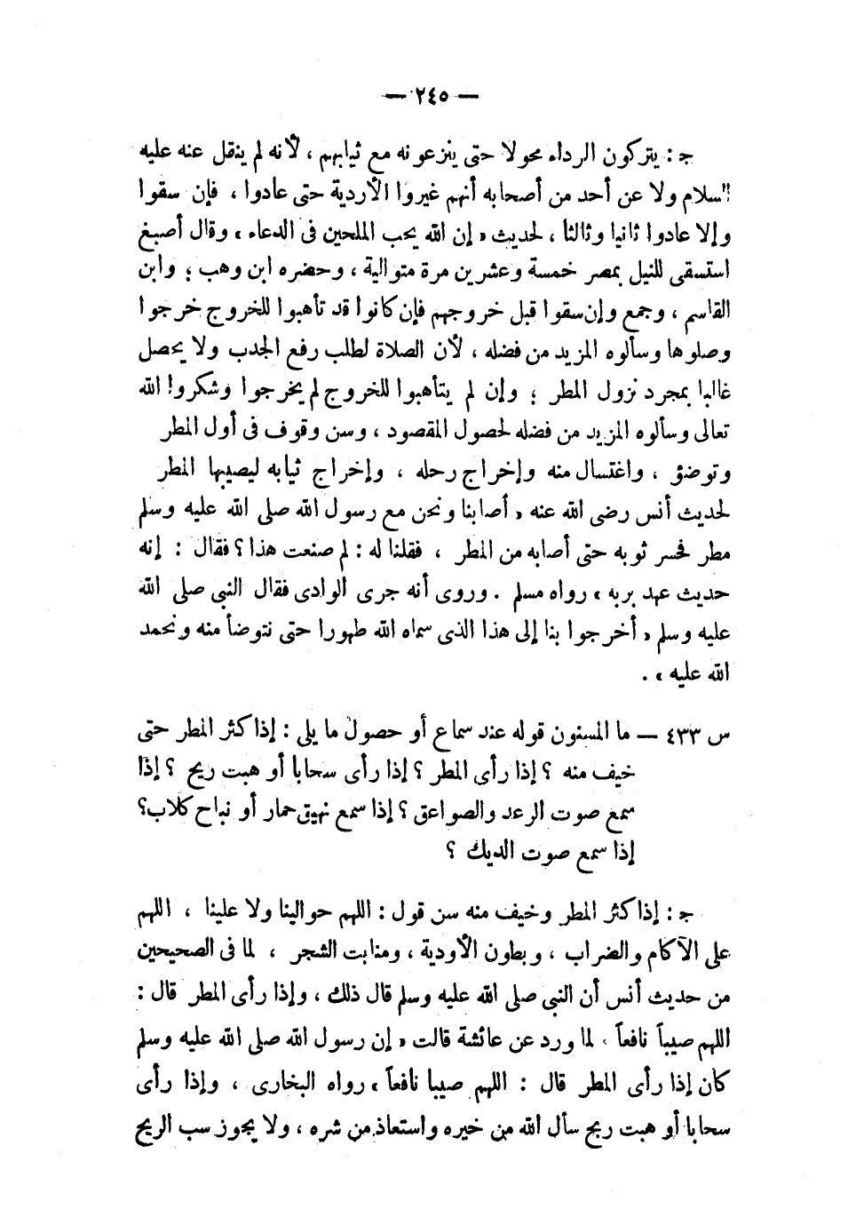 ج: يتركون الرداء محولاً حتى ينزعونه مع ثيابهم؛ لأنه لم ينقل عنه –عليه السلام- ولا عن أحد من أصحابه أنهم غيروا الأردية حتى عادوا؛ فإن سقوا وإلا عادوا ثانيًا وثالثًا؛ لحديث: «إن الله يحب الملحين في الدعاء» ، وقال أصبغ استسقى للنيل بمصر خمسة وعشرين مرة متوالية، وحضره ابن وهب، وابن القاسم، وجمع إن سقوا قبل خروجهم؛ فإن كانوا قد تأهبوا للخروج خرجوا وصلوها وسألوه المزيد من فضله؛ لأن الصلاة لطلب رفع الجدب ولا يحصل غالبًا بمجرد نزول المطر، وإن لم يتأهبوا للخروج لم يخرجوا وشكروا الله تعالى وسألوه المزيد من فضله لحصول المقصود، وسن وقوف في أول المطر وتوضؤا، واغتسال منه وإخراج رحله، وإخراج ثيابه ليصيبها المطر؛ لحديث أنس - رضي الله عنه - «أصابنا ونحن مع رسول الله صلى الله عليه وسلم مطر فحسر ثوبه حتى أصابه من المطر، فقلنا له: لِمَ صنعت هذا؟ فقال: «إنه حديث عهد بربه» » رواه مسلم. وروى أنه جرى الوادي، فقال النبي صلى الله عليه وسلم: «أخرجوا بنا إلى هذا الذي سماه الله طهورًا حتى نتوضأ منه ونحمد الله عليه» .