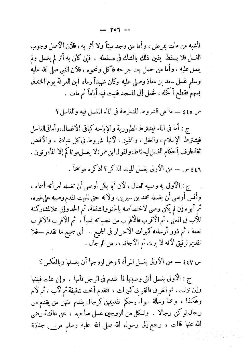 ج: أما في الماء فيشترط الطهورية والإباحة كباقي الأغسال؛ وأما في الغاسل فيشترط الإسلام، والعقل، والتمييز؛ لأنها شروط في كل عبادة، والأفضل ثقة عارف بأحكام الغسل ليحتاط، ولقول ابن عمر: لا يغسل موتاكم إلا المأمونون.