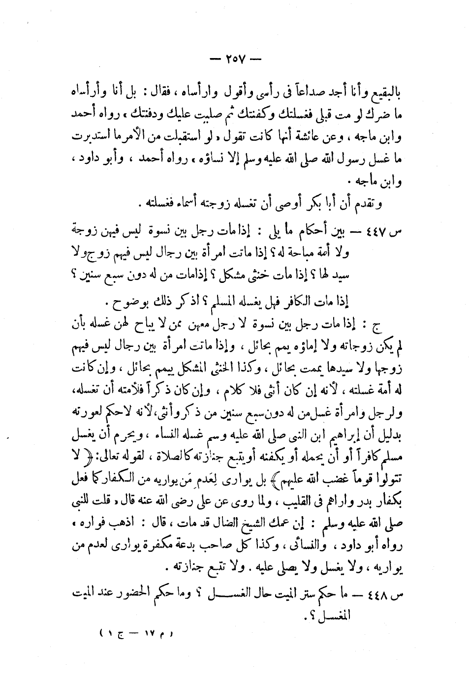 ج: إذا مات رجل بين نسوة لا رجل معهن ممن لا يباح لهن غسله بأن لم يكن زوجاته ولا إماؤه يمم بحائل، وإذا ماتت امرأة بين رجال ليس فيهم زوجها ولا سيدها يممت بحائل، وكذا الخنثى المشكل ييمم بحائل، وإن كانت له أمة غسلته؛ لأنه إن كان أنثى فلا كلام، وإن كان ذكرًا فلأمته أن تغسله، ولرجل وامرأة غسل من له دون سبع سنين من ذكر وأنثى؛ لأنه لا حكم لعورته بدليل أن إبراهيم ابن النبي صلى الله عليه وسلم غسله النساء، ويحرم أن يغسل مسلم كافرًا أو أن يحمله أو يكفنه أو يتبع جنازته كالصلاة، لقوله تعالى: {لاَ تَتَوَلَّوْا قَوْمًا غَضِبَ اللَّهُ عَلَيْهِمْ} بل يوارى لعدم من يواريه من الكفار كما فعل بكفار بدر واراهم في القليب، ولما روي عن علي - رضي الله عنه - قال: «قلت للنبي صلى الله عليه وسلم: إن عمك الشيخ الضال قد مات، قال: «اذهب فواره» » رواه أبو داود، والنسائي، وكذا كل صاحب بدعة مكفرة يوارى لعدم من يواريه، ولا يغسل ولا يصلى عليه، ولا تتبع جنازته.