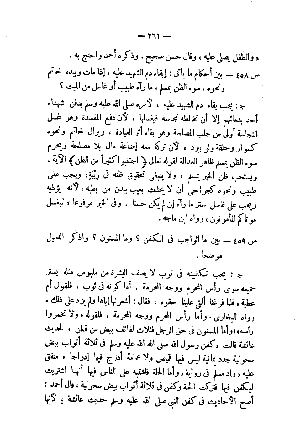 س461: بين أحكام ما يأتي: إبقاء دم الشهيد عليه، إذا مات وبيده خاتم ونحوه، سوء الظن بمسلم، ما رآه طبيب أو غاسل من الميت؟