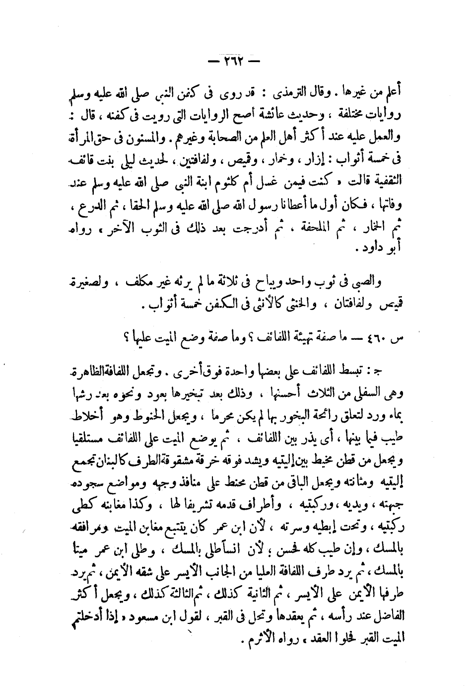 أعلم من غيرها. وقال الترمذي: قد روي في كفن النبي صلى الله عليه وسلم روايات مختلفة، وحديث عائشة أصح الروايات التي رويت في كفنه، قال: والعمل عليه عند أكثر أهل العلم من الصحابة وغيرهم، والمسنون في حق المرأة في خمسة أثواب: إزار، وخمار، وقميص، ولفافتين، لحديث ليلى بنت قائف الثقفية قالت: «كنت فيمن غسل أم كلثوم ابنة النبي صلى الله عليه وسلم عند وفاتها، فكان أول ما أعطانا رسول الله صلى الله عليه وسلم الحقا، ثم الدرع، ثم الخمار، ثم الملحفة، ثم أدرجت بعد ذلك في الثوب الآخر» رواه أبو داود.