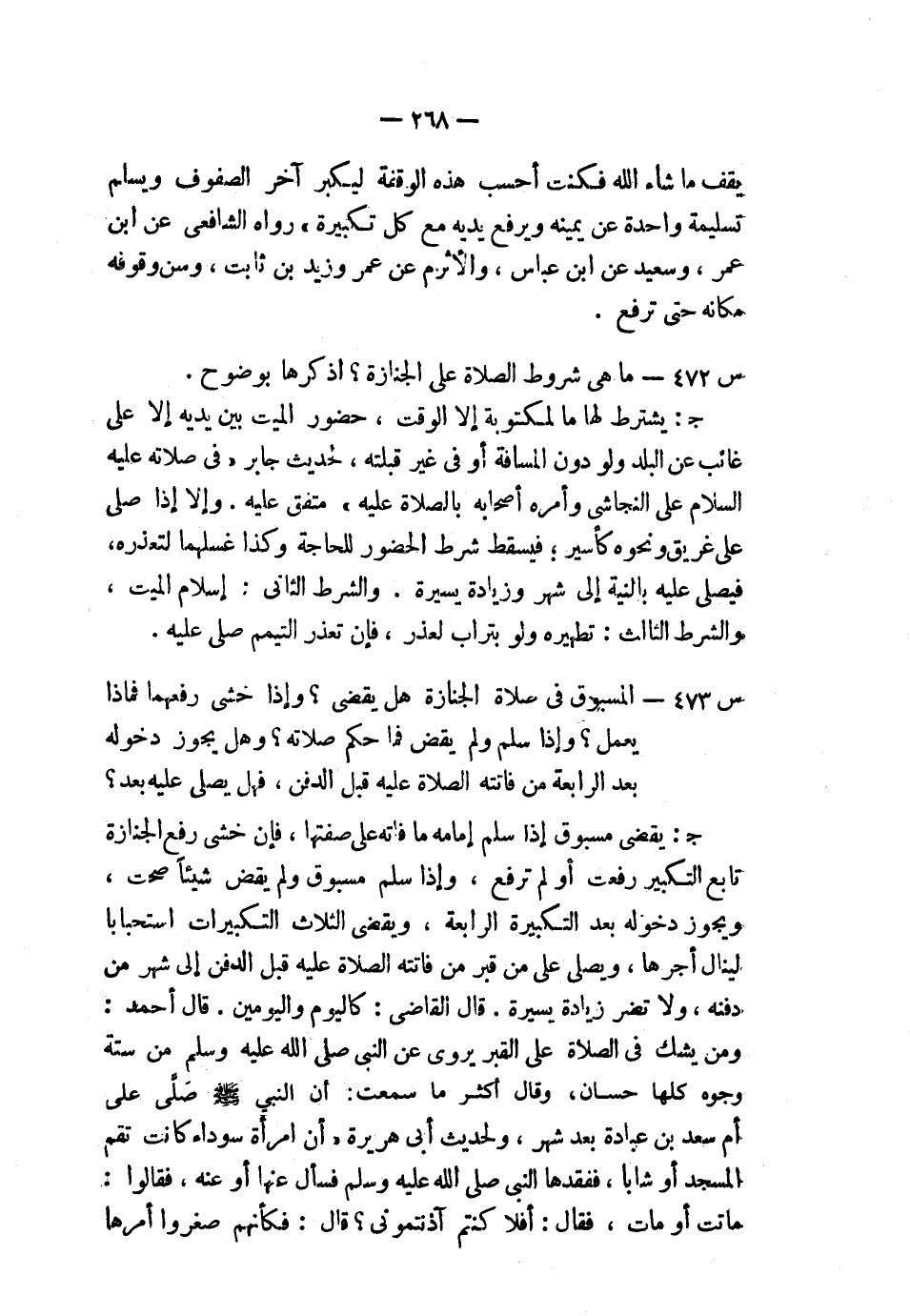 ج: يقضي مسبوق إذا سلم إمامه ما فاته على صفتها؛ فإن خشي رفع الجنازة تابع التكبير رفعت أو لم ترفع، وإذا سلم مسبوق ولم يقض شيئًا صحت، ويجوز دخوله بعد التكبيرة الرابعة، ويقضي الثلاث التكبيرات استحبابًا لينال أجرها، ويصلي على من قبر من فاتته الصلاة عليه قبل الدفن إلى شهر من دفنه، ولا تضر زيادة يسيرة، قال القاضي: كاليوم واليومين، قال أحمد: ومن يشك في الصلاة على القبر يُروى عن النبي صلى الله عليه وسلم من ستة وجوه كلها حسان، وقال أكثر ما سمعت: أن النبي صلى الله عليه وسلم صلَّى على أم سعد بن عبادة بعد شهر، ولحديث أبي هريرة: «أن امرأة سوداء كانت تقم المسجد أو شابًا، ففقدها النبي - صلى الله عليه وسلم - فسأل عنها أو عنه، فقالوا: ماتت أو مات، فقال: «أفلا كنتم آذنتموني؟» قال: فكأنهم صغروا أمرها