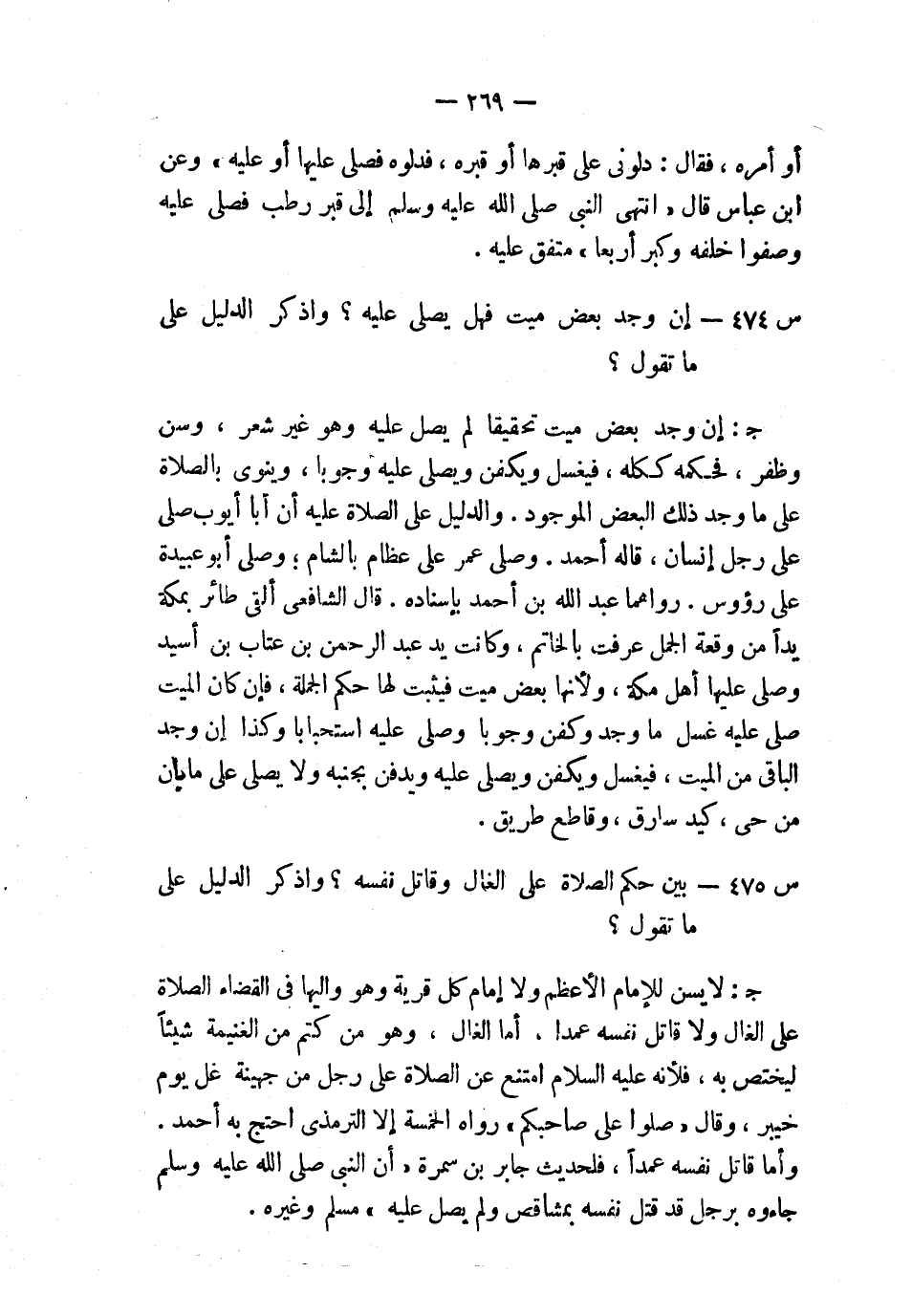 ج: لا يسن للإمام الأعظم ولا إمام كل قرية وهو واليها في القضاء الصلاة على الغال ولا قاتل نفسه عمدًا، أما الغال، وهو من كنتم من الغنيمة شيئًا ليختص به، فلأنه –عليه السلام- امتنع عن الصلاة على رجل من جهينة غل يوم خيبر، وقال: «صلوا على صاحبكم» رواه الخمسة إلا الترمذي احتج به أحمد؛ وأما قاتل نفسه عمدًا، فلحديث جابر بن سمرة: «أن النبي صلى الله عليه وسلم جاءوه برجل قد قتل نفسه بمشاقص ولم يصل عليه» مسلم وغيره.
