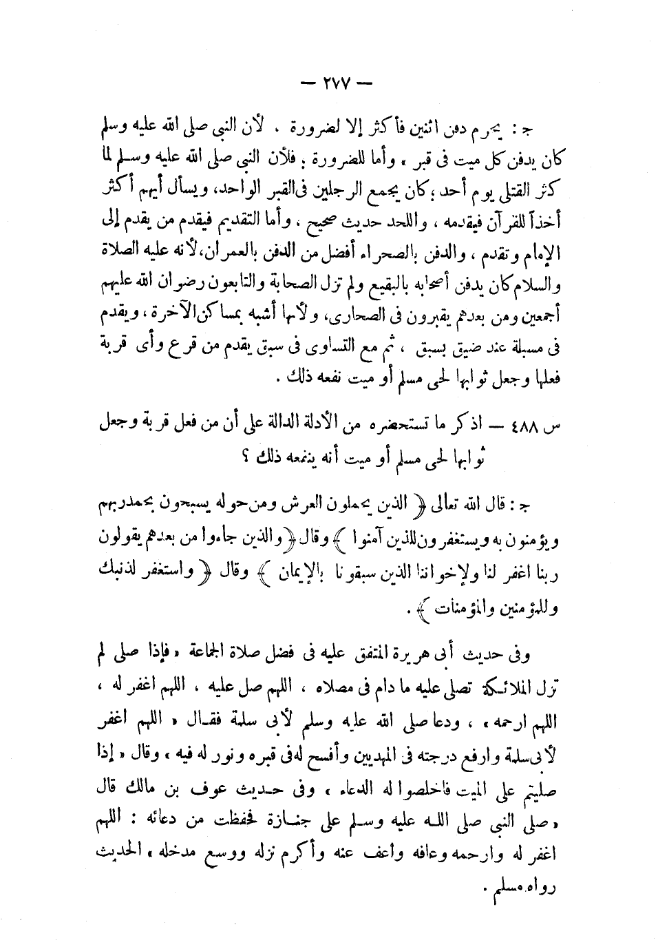 ج: يحرم دفن اثنين فأكثر إلا لضرورة؛ لأن النبي صلى الله عليه وسلم كان يدفن كل ميت في قبر؛ وأما للضرورة، فلأن النبي صلى الله عليه وسلم لما كثر القتلى يوم أُحد، كان يجمع الرجلين في القبر الواحد، ويسأل أيهم أكثر أخذًا للقرآن فيقدمه، واللحد حديث صحيح؛ وأما التقديم فيقدم من يقدم إلى الإمام وتقدم، والدفن بالصحراء أفضل من الدفن بالعمران؛ لأنه –عليه الصلاة والسلام- كان يدفن أصحابه بالبقيع ولم تزل الصحابة والتابعون –رضوان الله عليهم أجمعين- ومن بعدهم يقبرون في الصحارى؛ ولأنها أشبه بمساكن الآخرة، ويقدم في مسبلة عند ضيق بسبق، ثم مع التساوي في سبق يقدم من قرع وأي قرية فعلها وجعل ثوابها لحي مسلم أو ميت نفعه ذلك.