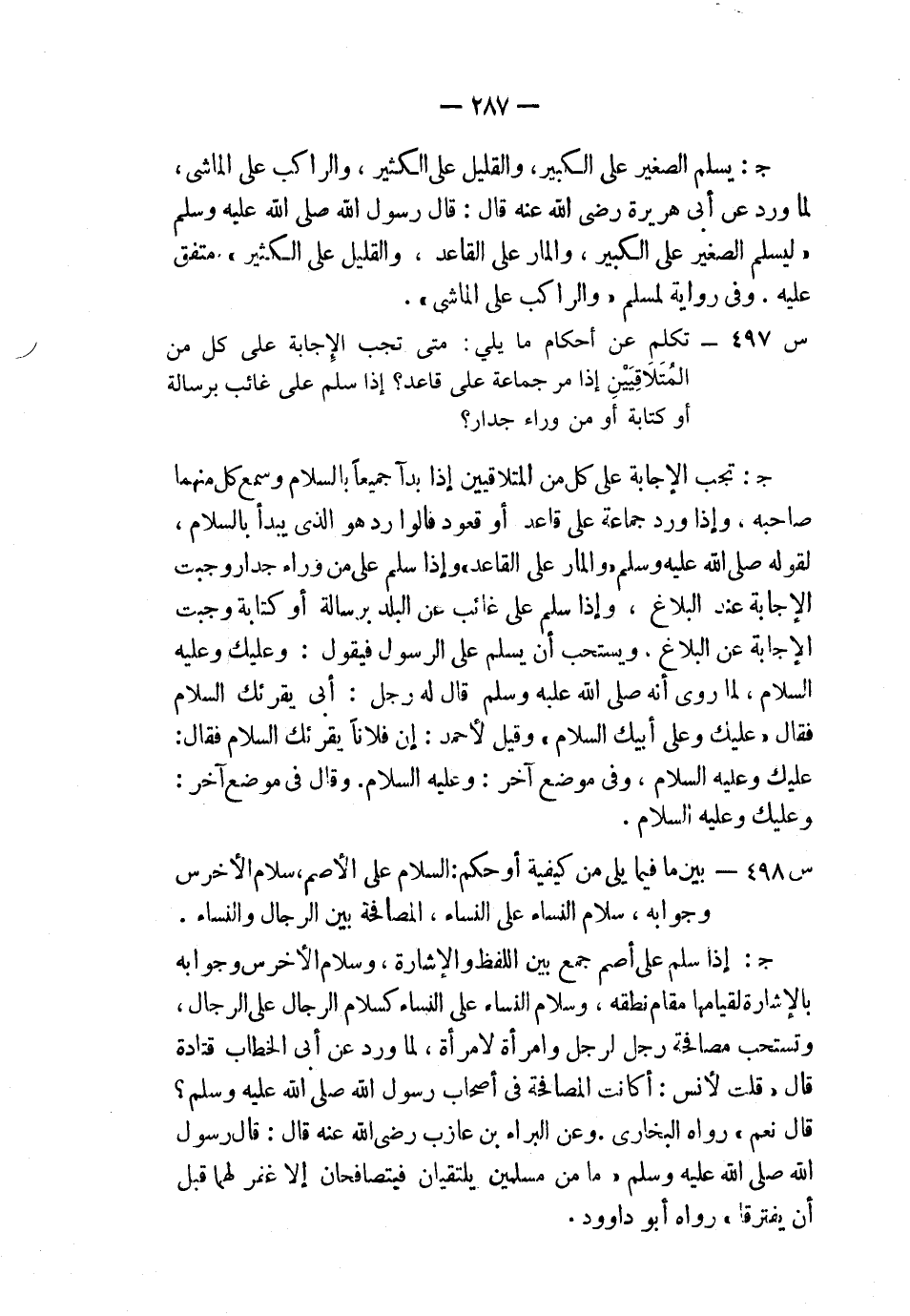ج: تجب الإجابة على كل من المتلاقيين إذا بدآ جميعًا بالسلام وسمع كل منهما صاحبه، وإذا ورد جماعة على قاعد أو قعود فالوارد هو الذي يبدأ بالسلام؛ لقوله صلى الله عليه وسلم: «والمار على القاعد» وإذا سلم على من وراء جدار وجبت الإجابة عند البلاغ، وإذا سلم على غائب عن البلد برسالة أو كتابة وجبت الإجابة عن البلاغ، ويستحب أن يسلم على الرسول، فيقول: وعليك وعليه السلام، لما روي أنه صلى الله عليه وسلم قال له رجل: أبي يقرئك السلام، فقال: «عليك وعليه السلام» ، وفي موضع آخر: «وعليه السلام» ، وقال في موضع آخر: «وعليك وعليه السلام» .