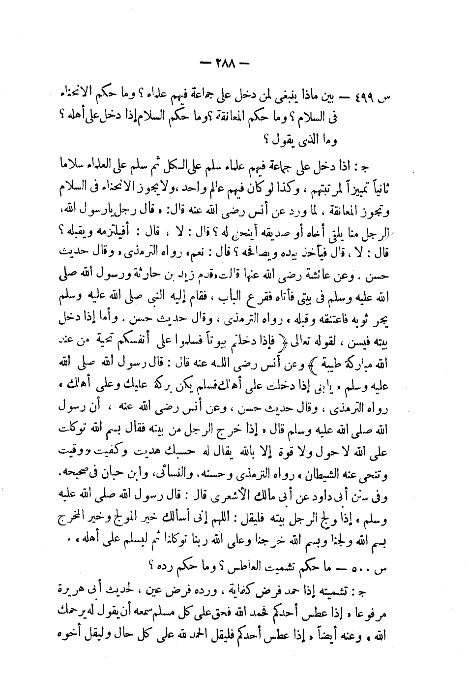ج: إذا دخل على جماعة فيهم علماء سلم على الكل، ثم سلم على العلماء سلامًا ثانيًا تمييزًا لمرتبتهم، وكذا لو كان فيهم عالم واحد، ولا يجوز الانحناء في السلام وتجوز المعانقة، لما ورد عن أنس - رضي الله عنه - قال: قال رجل: يا رسول الله، الرجل منا يلقى أخاه أو صديقه أينحني له؟ قال: «لا» ، قال: أفيلتزمه ويقبله؟ قال: «لا» ، قال: فيأخذ بيده ويصافحه؟ قال: «نعم» رواه الترمذي، وقال: حديث حسن. وعن عائشة ـ رضي الله عنها ـ قالت: «قدم زيد بن حارثة ورسول الله صلى الله عليه وسلم في بيتي فأتاه فقرع الباب، فقام إليه النبي صلى الله عليه وسلم يجر ثوبه فاعتنقه وقبله» رواه الترمذي، وقال: حديث حسن؛ وأما إذا دخل بيته فيُسن، لقوله تعالى: {فَإِذَا دَخَلْتُم بُيُوتًا فَسَلِّمُوا عَلَى أَنفُسِكُمْ تَحِيَّةً مِّنْ عِندِ اللَّهِ مُبَارَكَةً طَيِّبَةً} ، وعن أنس - رضي الله عنه - قال: قال رسول الله صلى الله عليه وسلم: «يا بني، إذا دخلت على أهلك فسلم يكن بركة عليك وعلى أهلك» رواه الترمذي، وقال: حديث حسن، وعن أنس - رضي الله عنه -: أن رسول الله صلى الله عليه وسلم قال: «إذا خرج الرجل من بيته، فقال: بسم الله توكلت على الله لا حول ولا قوة إلا بالله، يقال له: حسبك هديت وكفيت ووقيت وتنحى عنه الشيطان» رواه الترمذي وحسنه، والنسائي، وابن حبان في «صحيحه» ، وفي «سنن أبي داود» عن أبي مالك الأشعري قال: قال رسول الله صلى الله عليه وسلم: «إذا ولج الرجل بيته فليقل: اللهم إني أسألك خير المولج وخير المخرج بسم الله ولجنا وبسم الله خرجنا وعلى الله ربنا توكلنا ثم ليسلم على أهله» .