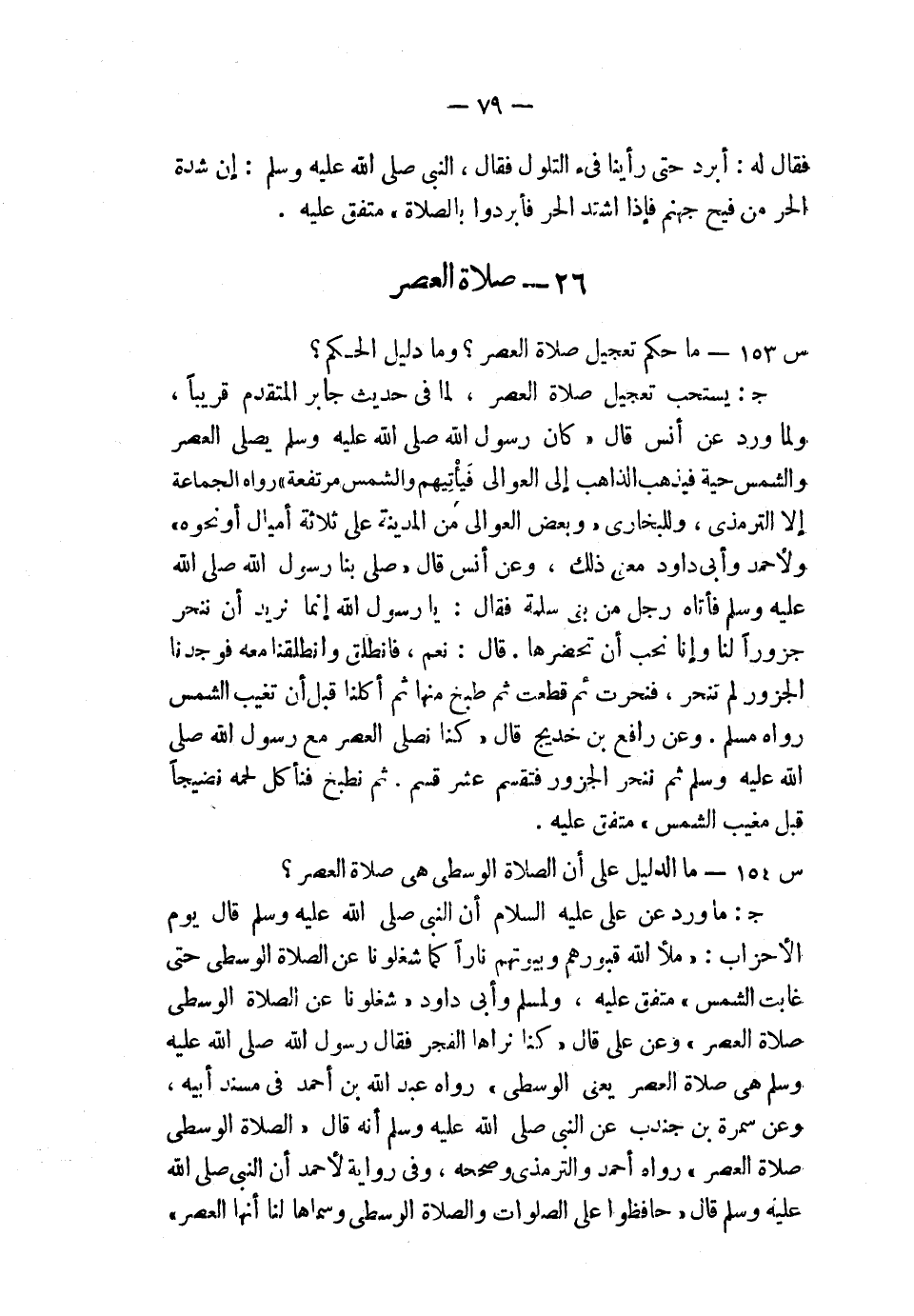 ج: ما ورد عن علي-عليه السلام-أن النبي - صلى الله عليه وسلم - قال يوم الأحزاب: «ملأ الله قبورهم وبيوتهم نارًا كما شغلونا عن الصلاة الوسطى حتى غابت الشمس» متفق عليه، ولمسلم وأبي داود: «شغلونا عن الصلاة الوسطى صلاة العصر» ، وعن علي قال: كنا نراها الفجر، فقال رسول الله صلى الله عليه وسلم: «هي صلاة العصر -يعني الوسطى» رواه عبد الله بن أحمد في مسند أبيه، وعن سمرة بن جندب عن النبي صلى الله عليه وسلم أنه قال: «الصلاة الوسطى صلاة العصر» رواه أحمد والترمذي وصححه، وفي رواية لأحمد أن النبي - صلى الله عليه وسلم - قال: «حافظوا على الصلوات والصلاة الوسطى وسماها لنا أنها العصر» ،