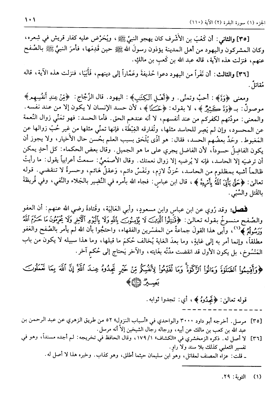 ومعنى وَدَّ: أحب وتمنى. وأَهْلِ الْكِتابِ: اليهود. قال الزجاج: مِنْ عِنْدِ أَنْفُسِهِمْ موصول: ب وَدَّ كَثِيرٌ، لا بقوله: حَسَداً، لأن حسد الإنسان لا يكون إلا من عند نفسه.