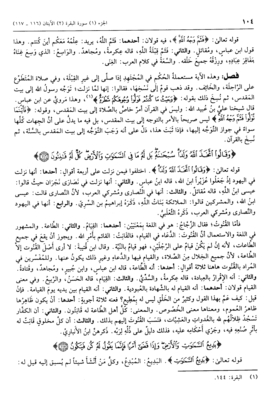 قال شيخنا علي بن عبيد الله: وليس في القرآن أمر خاص بالصلاة إلى بيت المقدس، وقوله: فَأَيْنَما تُوَلُّوا فَثَمَّ وَجْهُ اللَّهِ ليس صريحاً بالأمر بالتوجه إلى بيت المقدس، بل فيه ما يدل على أن الجهات كلها سواء في جواز التوجه إليها، فإذا ثبت هذا، دل على أنه وجب التوجه إلى بيت المقدس بالسّنّة، ثم نسخ بالقرآن.