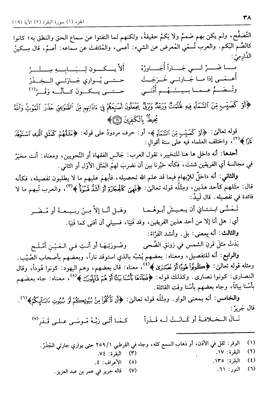 أَوْ كَصَيِّبٍ مِنَ السَّماءِ فِيهِ ظُلُماتٌ وَرَعْدٌ وَبَرْقٌ يَجْعَلُونَ أَصابِعَهُمْ فِي آذانِهِمْ مِنَ الصَّواعِقِ حَذَرَ الْمَوْتِ وَاللَّهُ مُحِيطٌ بِالْكافِرِينَ (19)