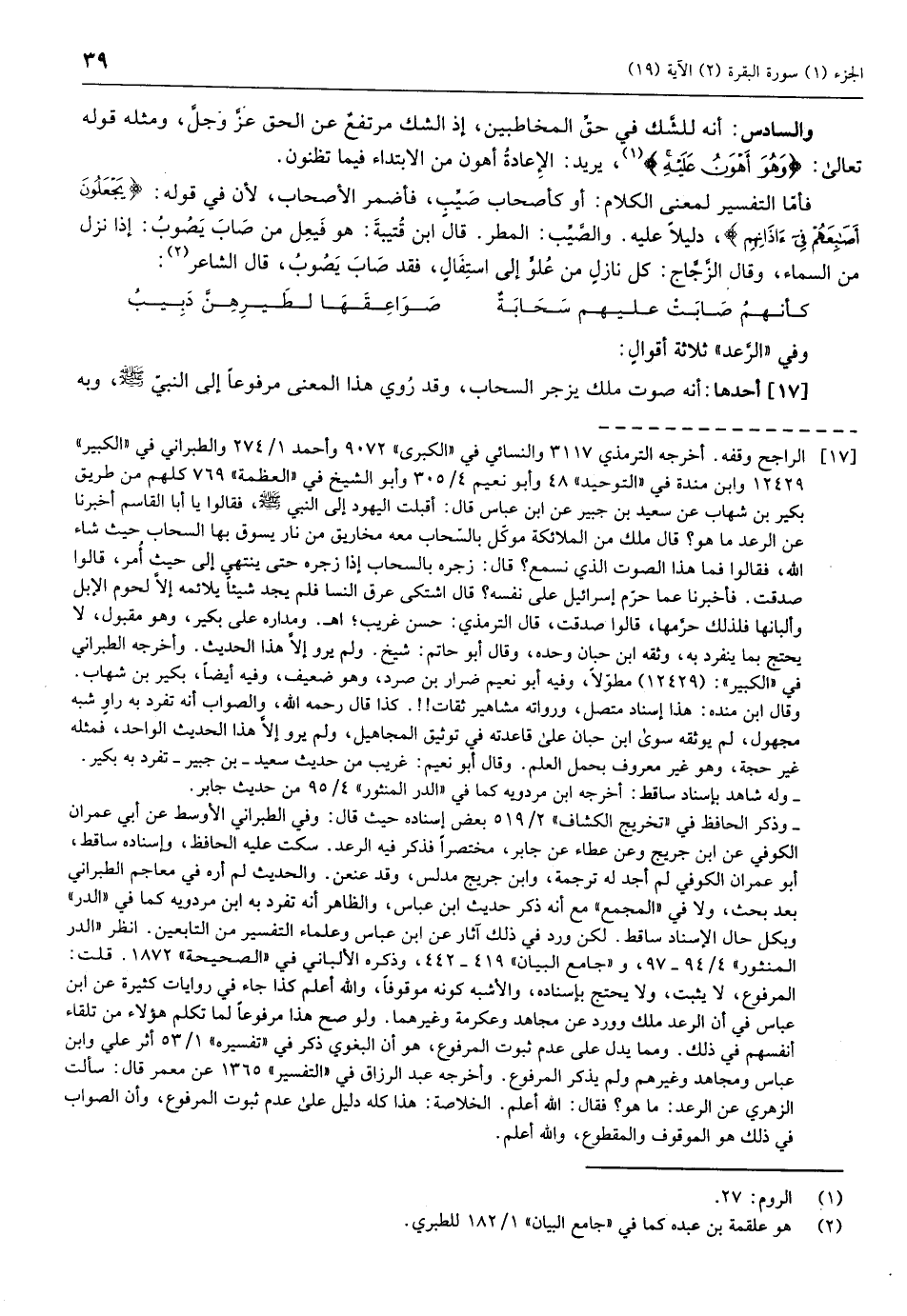 المرفوع، لا يثبت، ولا يحتج بإسناده، والأشبه كونه موقوفا، والله أعلم كذا جاء في روايات كثيرة عن ابن عباس في أن الرعد ملك وورد عن مجاهد وعكرمة وغيرهما. ولو صح هذا مرفوعا لما تكلم هؤلاء من تلقاء أنفسهم في ذلك. ومما يدل على عدم ثبوت المرفوع، هو أن البغوي ذكر في «تفسيره» 1/ 53 أثر علي وابن عباس ومجاهد وغيرهم ولم يذكر المرفوع. وأخرجه عبد الرزاق في «التفسير» 1365 عن معمر قال: سألت الزهري عن الرعد: ما هو؟ فقال: الله أعلم. الخلاصة: هذا كله دليل على عدم ثبوت المرفوع، وأن الصواب في ذلك هو الموقوف والمقطوع، والله أعلم.