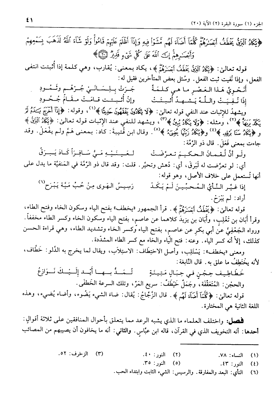 يَكادُ الْبَرْقُ يَخْطَفُ أَبْصارَهُمْ كُلَّما أَضاءَ لَهُمْ مَشَوْا فِيهِ وَإِذا أَظْلَمَ عَلَيْهِمْ قامُوا وَلَوْ شاءَ اللَّهُ لَذَهَبَ بِسَمْعِهِمْ وَأَبْصارِهِمْ إِنَّ اللَّهَ عَلى كُلِّ شَيْءٍ قَدِيرٌ (20)