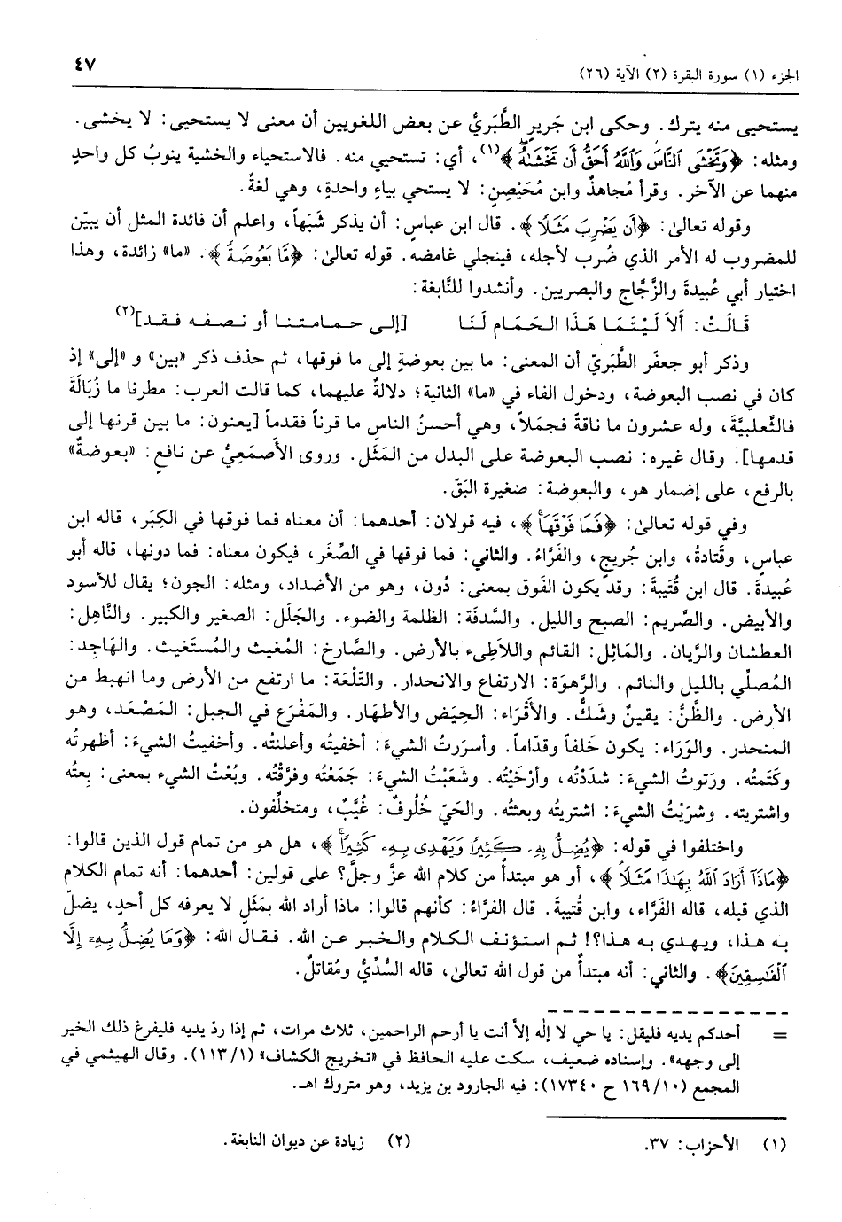 وذكر أَبو جعفر الطبري أن المعنى: ما بين بعوضة إِلى ما فوقها، ثم حذف ذكر «بين» و «إِلى» إِذ كان في نصب البعوضة، ودخول الفاء في «ما» الثانية دلالة عليهما، كما قالت العرب: مطرنا ما زبالة فالثعلبية، وله عشرون ما ناقة فجملاً، وهي أحسن الناس ما قرناً فقدماً [يعنون: ما بين قرنها إلى قدمها] . وقال غيره: نصب البعوضة على البدل من المثل. وروى الأصمعي عن نافع: «بعوضةٌ» بالرفع، على إِضمار هو، والبعوضة: صغيرة البقّ.