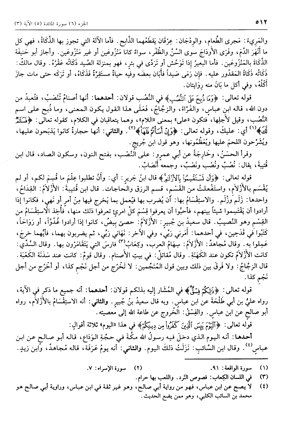 قوله تعالى: وَما ذُبِحَ عَلَى النُّصُبِ في النصب قولان: أحدهما: أنها أصنام تنصب، فتُعبد من دون الله، قاله ابن عباس، والفراء، والزجاج، فعلى هذا القول يكون المعنى، وما ذبح على اسم النُّصب، وقيل لأجلها، فتكون «على» بمعنى «اللام» ، وهما يتعاقبان في الكلام، كقوله تعالى: فَسَلامٌ لَكَ «1» أي: عليك، وقوله تعالى: وَإِنْ أَسَأْتُمْ فَلَها «2» . والثاني: أنها حجارة كانوا يذبحون عليها، ويشرِّحون اللحم عليها ويعظمونها، وهو قول ابن جريج.
