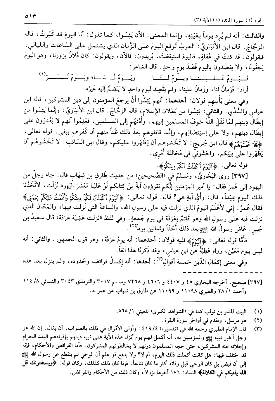 (3) قال الإمام الطبري رحمه الله في «تفسيره» 4/ 419: وأولى الأقوال في ذلك بالصواب، أن يقال: إن الله عز وجل أخبر نبيه صلّى الله عليه وسلّم والمؤمنين به، أنه أكمل لهم يوم أنزل هذه الآية على نبيه دينهم بإفرادهم البلد الحرام وإجلائه عنه المشركين، حتى حجه المسلمون دونهم لا يخالطونهم المشركون. فأما الفرائض والأحكام، فإنه قد اختلف فيها: هل كانت أكملت ذلك اليوم، أم لا؟ ولا يدفع ذو علم أن الوحي لم ينقطع عن رسول الله صلّى الله عليه وسلّم إلى أن قبض بل كان الوحي قبل وفاته أكثر ما كان تتابعا. فإذا كان ذلك كذلك، وكان قوله: يَسْتَفْتُونَكَ قُلِ اللَّهُ يُفْتِيكُمْ فِي الْكَلالَةِ النساء: 176 آخرها نزولا، وكان ذلك من الأحكام والفرائض.