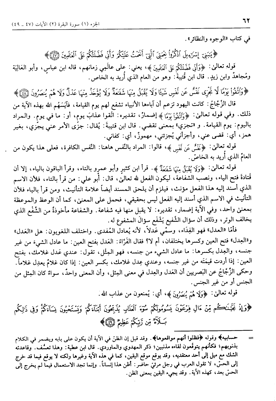 قال الزجاج: كانت اليهود تزعم أَن آباءها الأنبياء تشفع لهم يوم القيامة، فآيسهم الله بهذه الآية من ذلك. وفي قوله تعالى: وَاتَّقُوا يَوْماً إضمار، تقديره: اتقوا عذاب يوم، أو: ما في يوم. والمراد باليوم: يوم القيامة. و «تجزي» بمعنى تقضي. قال ابن قتيبة: يقال: جزى الأمر عني يجزي، بغير همز، أي: قضى عني، وأجزأني يجزئني، مهموز، أي: كفاني.