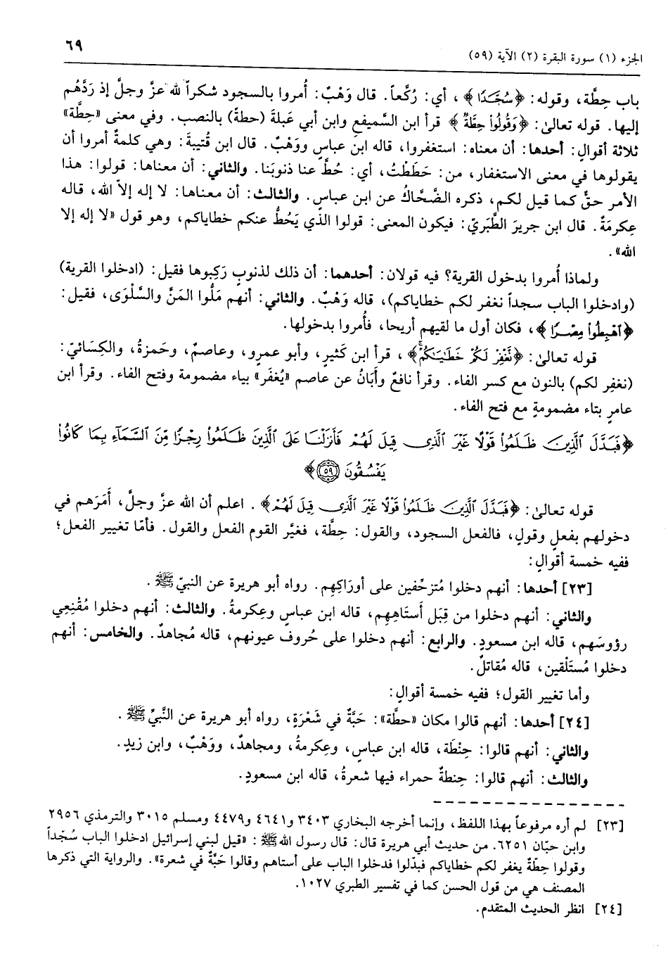 باب حطة، وقوله: سُجَّداً، أي: ركعاً. قال وهب: أمروا بالسجود شكرا لله عزّ وجلّ إذ ردهم إليها. قوله تعالى: وَقُولُوا حِطَّةٌ قرأ ابن السميفع وابن أبي عبلة (حطةً) بالنصب. وفي معنى «حطة» ثلاثة أقوال: أحدها: أن معناه: استغفروا، قاله ابن عباس ووهب. قال ابن قتيبة: وهي كلمة أُمروا أن يقولوها في معنى الاستغفار، من: حططت، أي: حط عنا ذنوبنا. والثاني: أن معناها: قولوا: هذا الأمر حق كما قيل لكم، ذكره الضحاك عن ابن عباس. والثالث: أن معناها: لا إله إلا الله، قاله عكرمة. قال ابن جرير الطبري: فيكون المعنى: قولوا الذي يحط عنكم خطاياكم، وهو قول «لا إِله إِلا الله» .