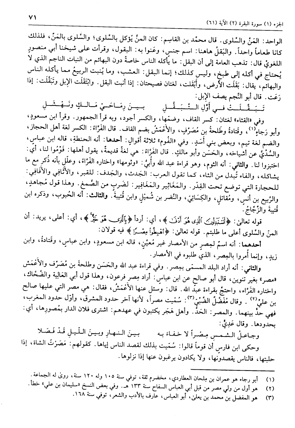 الواحد: المن والسلوى. قال محمد بن القاسم: كان المن يؤكل بالسلوى والسلوى بالمن، فلذلك كانا طعاماً واحداً. والبقل هاهنا: اسم جنس، وعنوا به: البقول، وقرأت على شيخنا أبي منصور اللغوي قال: تذهب العامة إِلى أن البقل: ما يأكله الناس خاصة دون البهائم من النبات الناجم الذي لا يحتاج في أكله إلى طبخ، وليس كذلك إِنما البقل: العشب، وما ينبت الربيع مما يأكله الناس والبهائم، يقال: بقلت الأرض، وأبقلت، لغتان فصيحتان: إذا أنبت البقل. وابتقلت الإبل وتبقّلت: إذا رعت. قال أبو النجم يصف الإبل:
