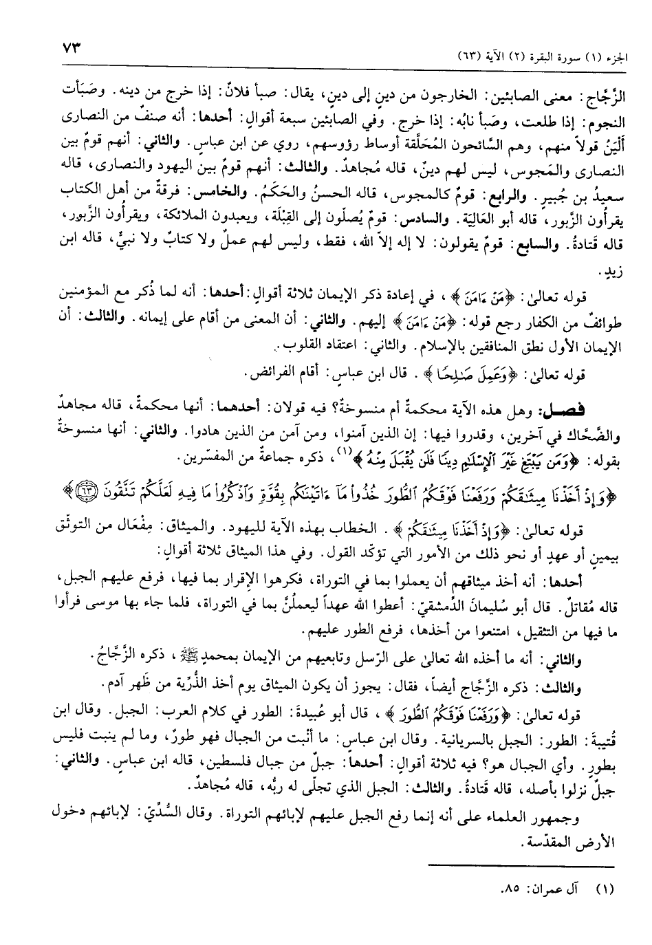 الزجاج: معنى الصابئين: الخارجون من دين إلى دين، يقال: صبأ فلان: إذا خرج من دينه. وصبأت النجوم: إذا طلعت، وصبأ نابُه: إِذا خرج. وفي الصابئين سبعة أقوال: أحدها: أنه صنف من النصارى ألين قولاً منهم، وهم السائحون المحلَّقة أوساط رؤوسهم، روي عن ابن عباس. والثاني: أنهم قوم بين النصارى والمجوس، ليس لهم دين، قاله مجاهد. والثالث: أنهم قوم بين اليهود والنصارى، قاله سعيد بن جبير. والرابع: قوم كالمجوس، قاله الحسن والحكم. والخامس: فرقة من أهل الكتاب يقرءون الزبور، قاله أبو العالية. والسادس: قوم يصلون إلى القبلة، ويعبدون الملائكة، ويقرءون الزبور، قاله قتادة. والسابع: قوم يقولون: لا إِله إلا الله، فقط، وليس لهم عمل ولا كتاب ولا نبي، قاله ابن زيد.